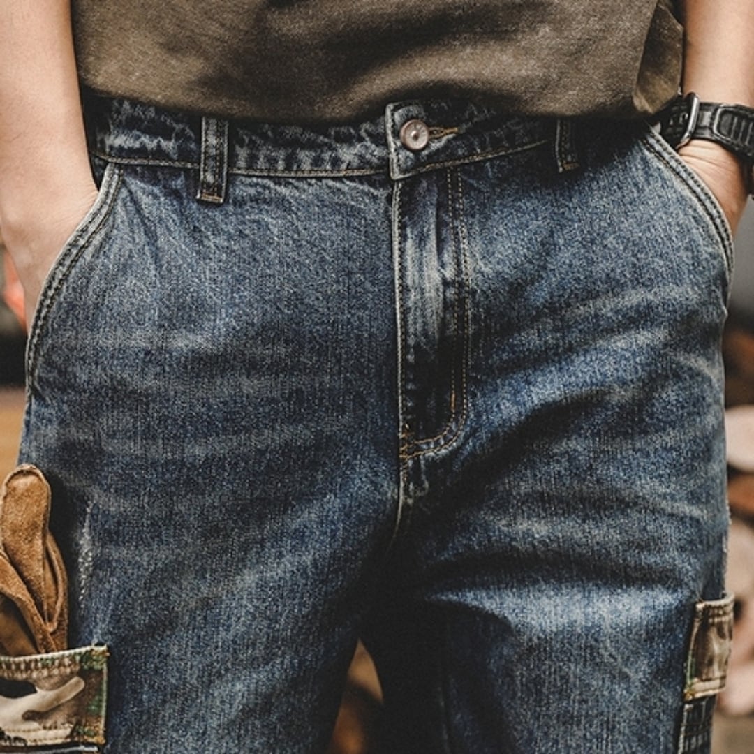 カモフラージュ柄がアクセントになった、おしゃれなデニムジーンズ。