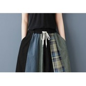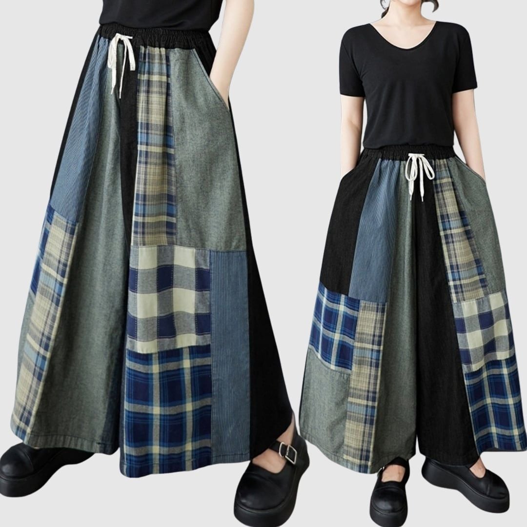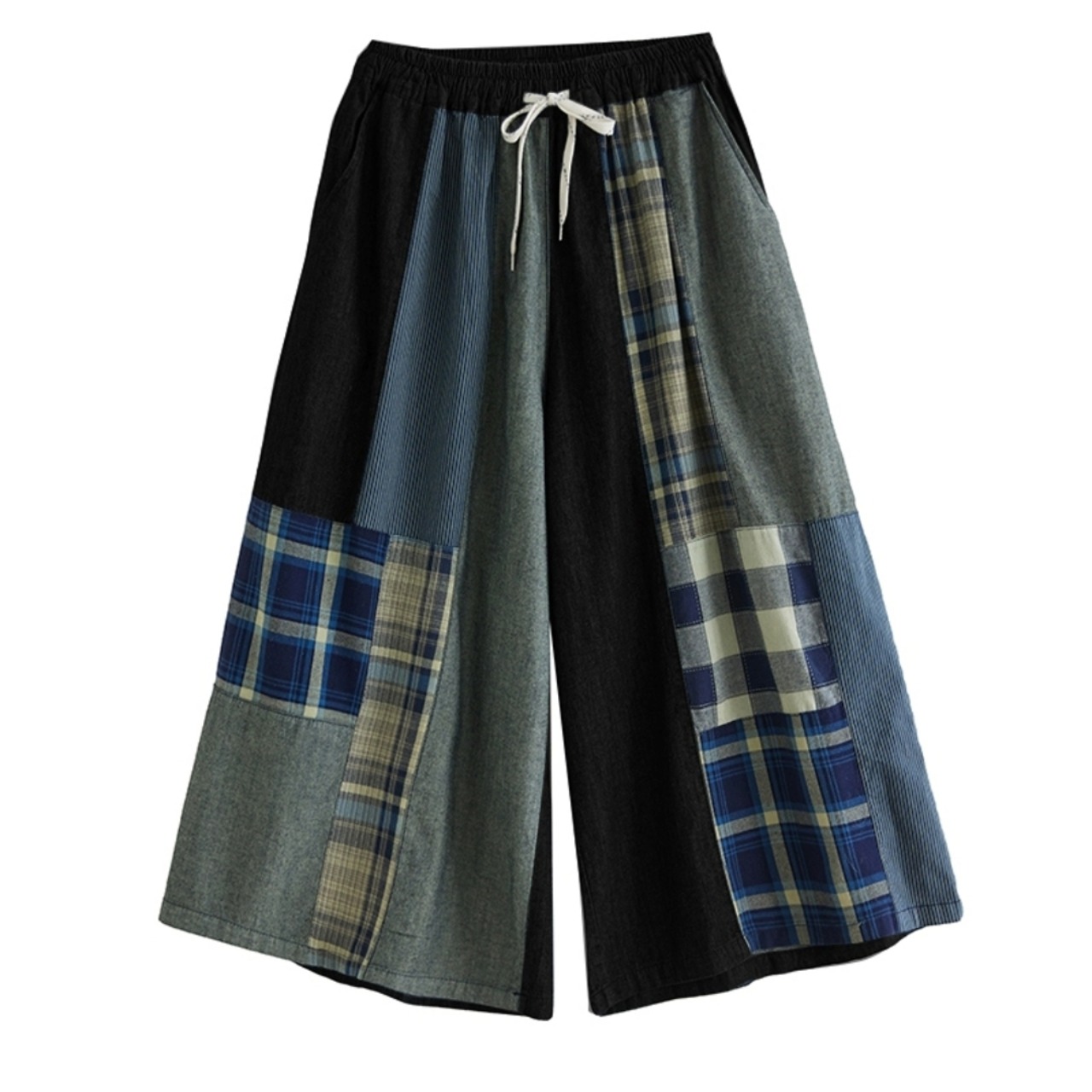 大胆なパッチワーク柄が目を引くフレアワイドパンツ。