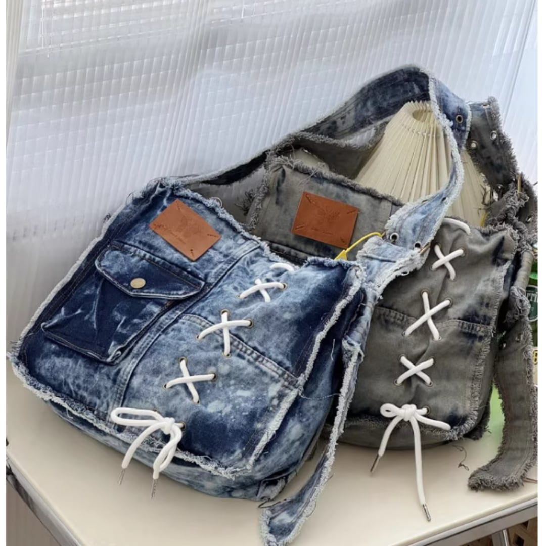 ユーズド風のデニム素材を使用したメッセンジャーバッグ。