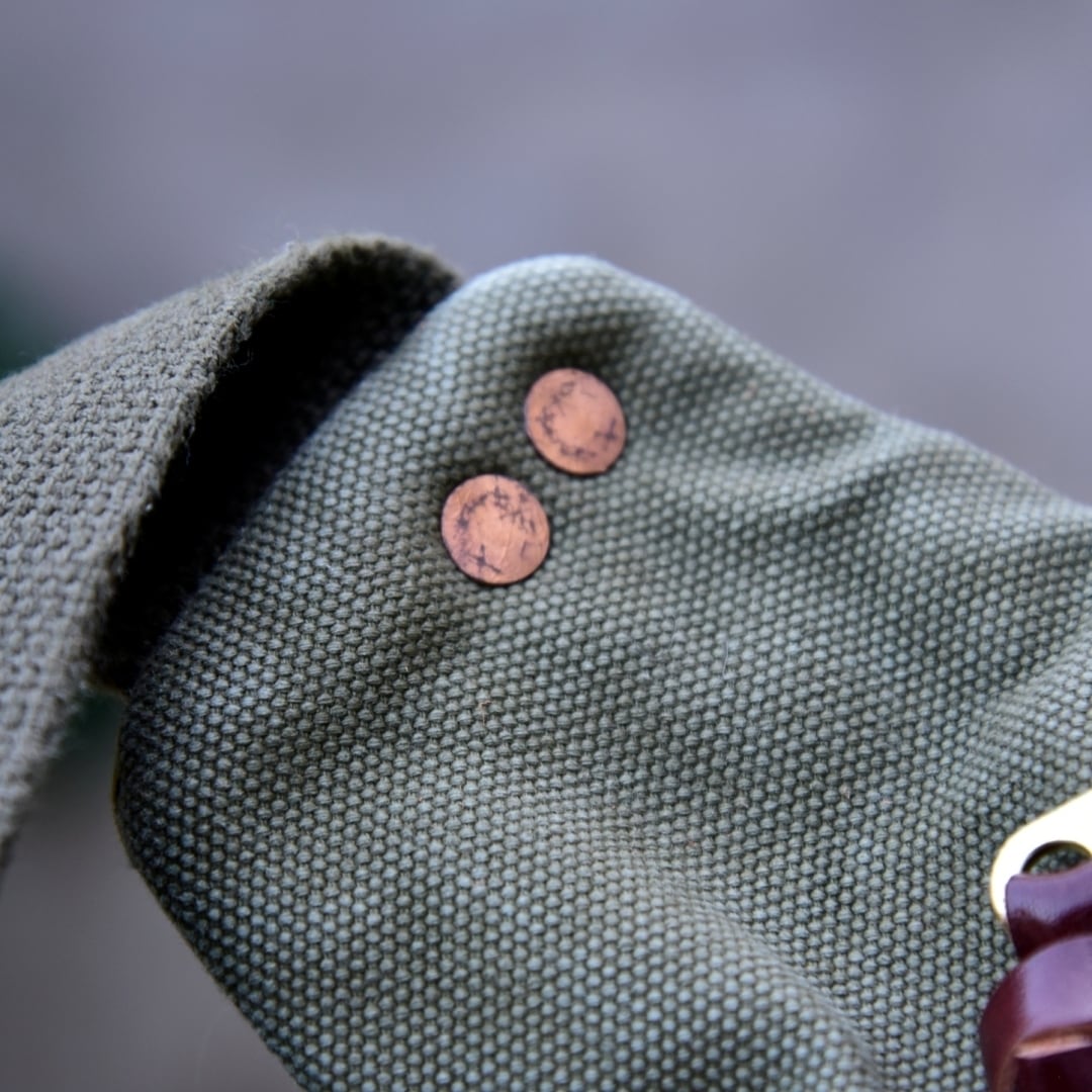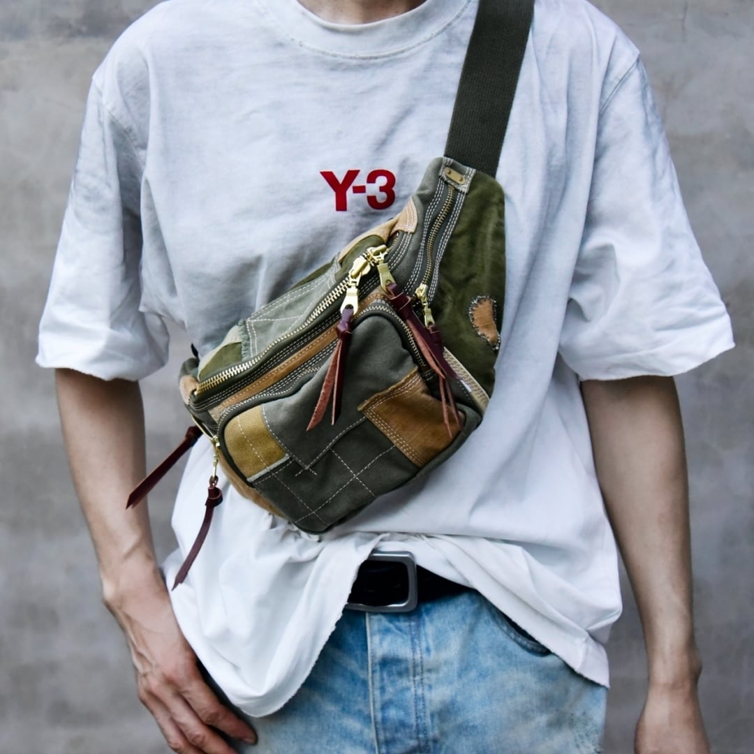 落ち着いたグリーンデニムを使用したパッチワークウエストバッグ。