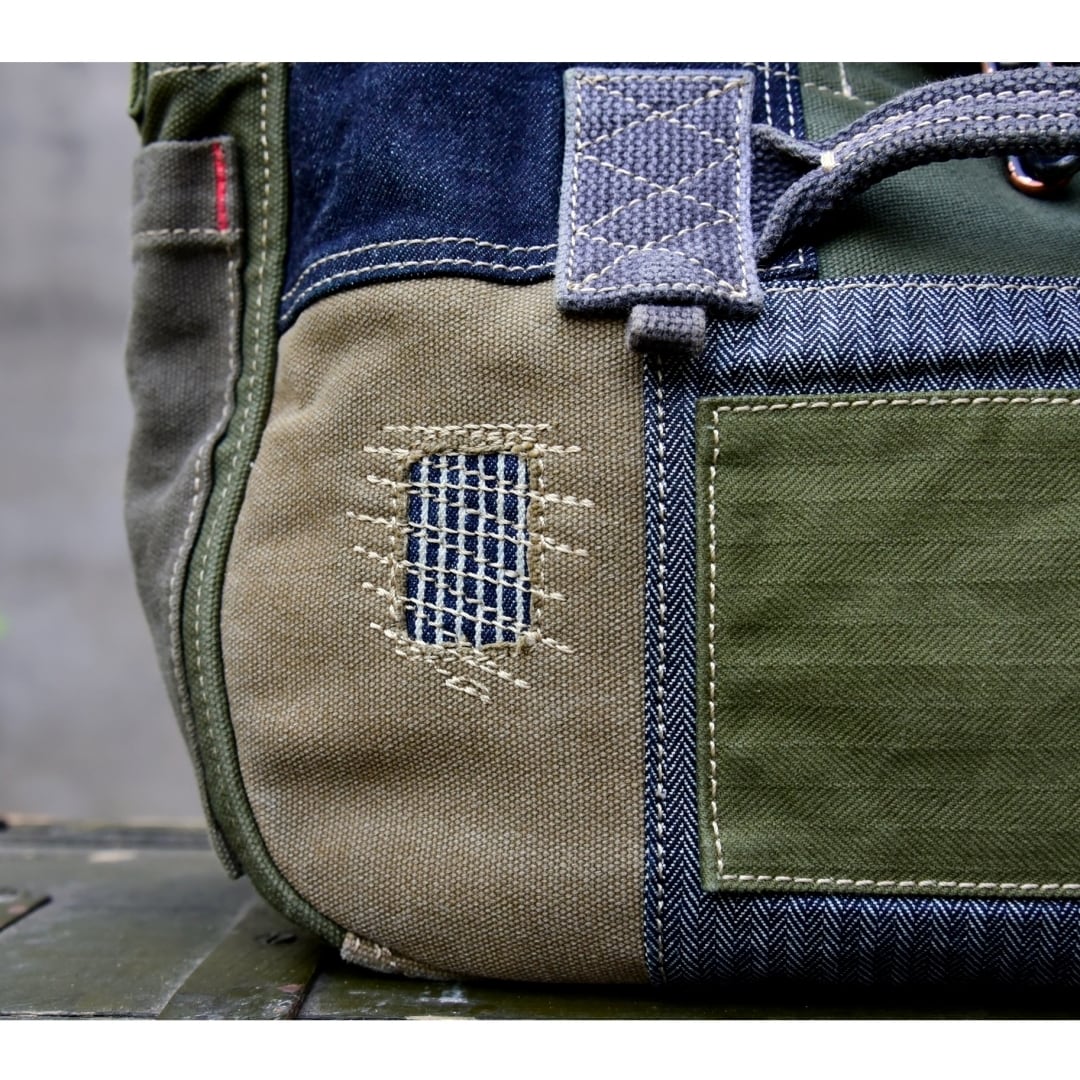 機能的でおしゃれなパッチワーク柄のデニムメッセンジャーバッグ。