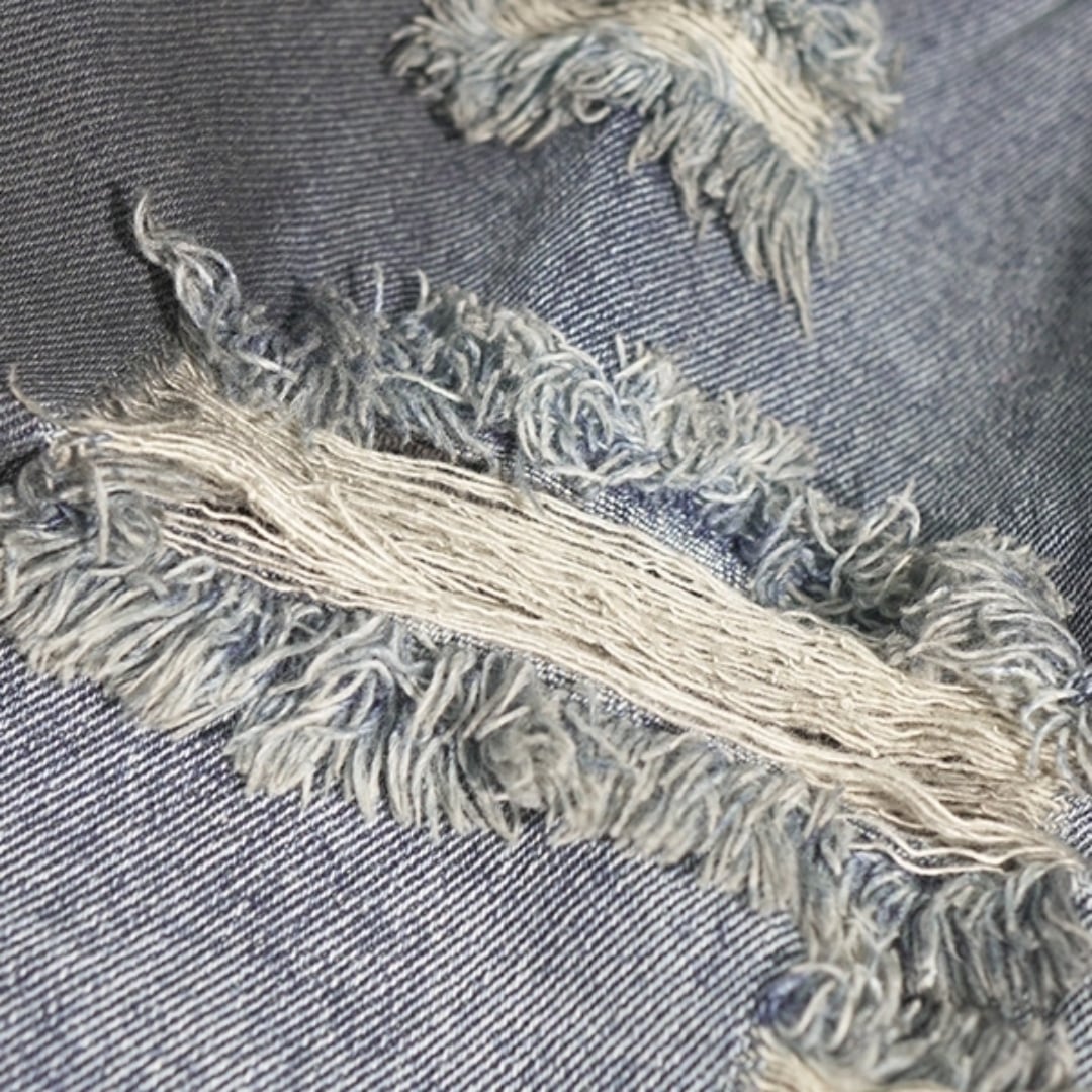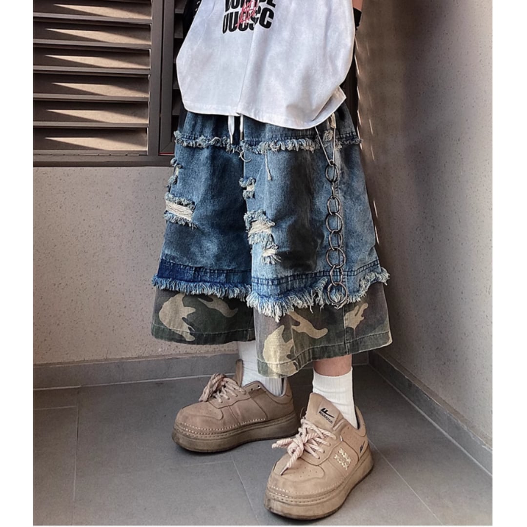 ダメージ感と裾のカモフラ柄が目を引くワイドレッグクロップドデニムジーンズ。