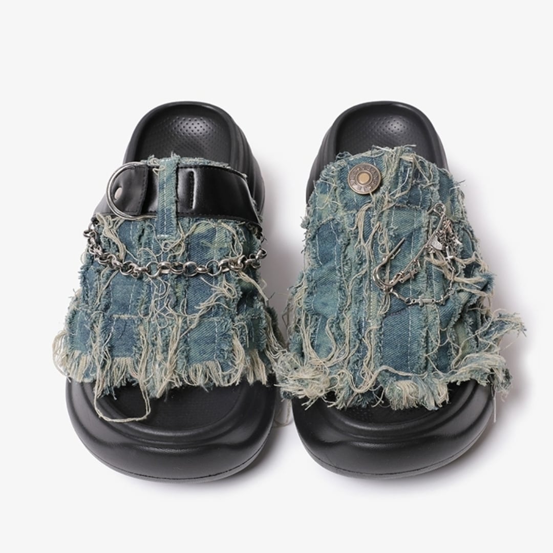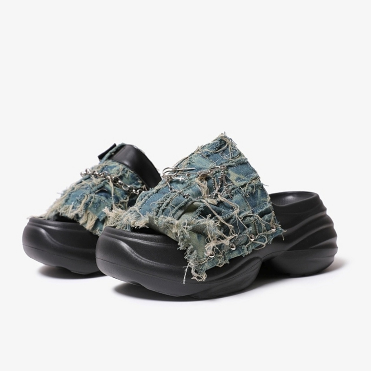 アシンメトリーデザインが特徴の厚底デニムサンダル。