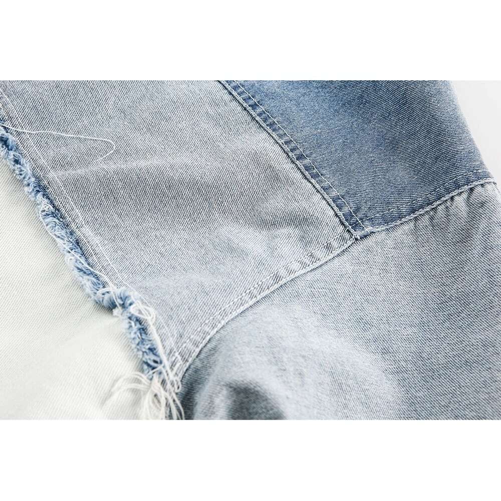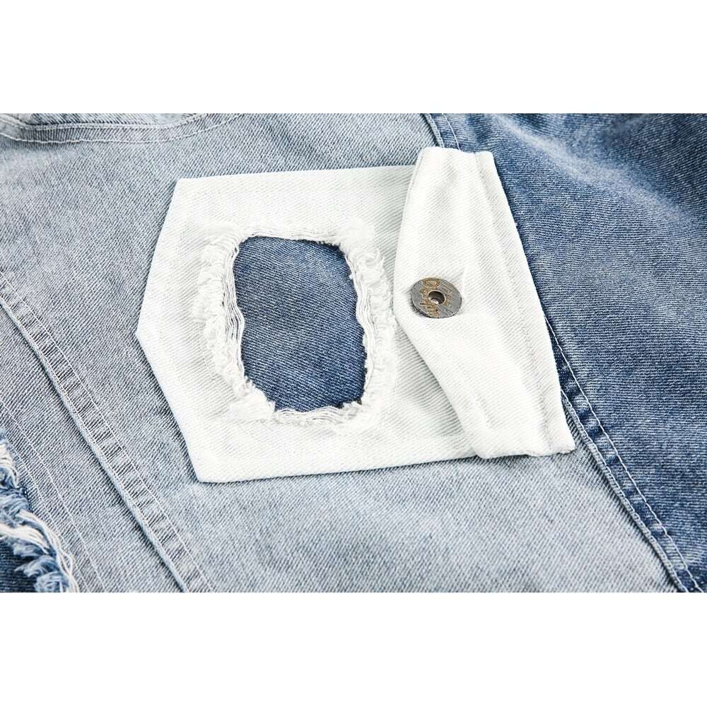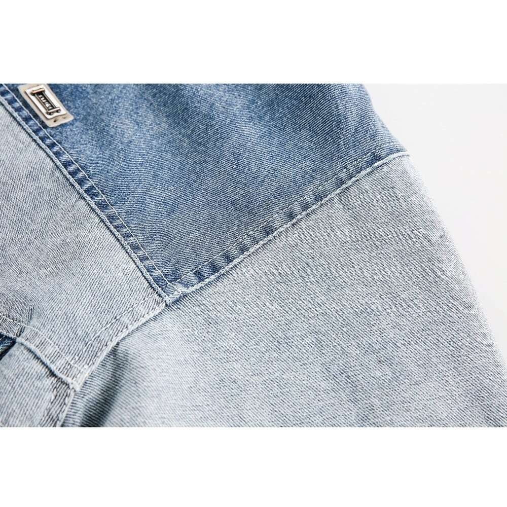 パッチワーク風デザインがおしゃれなスタンドカラーデニムジャケット。