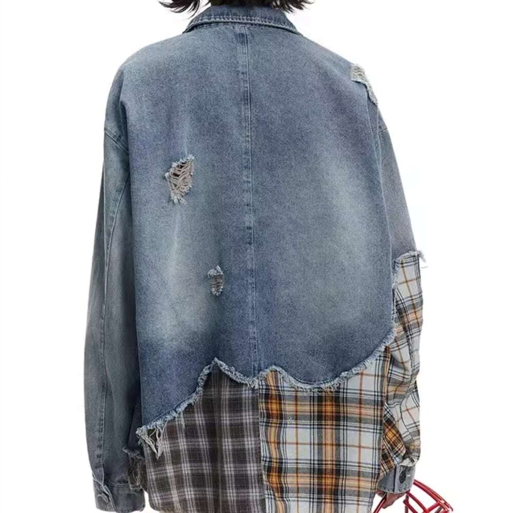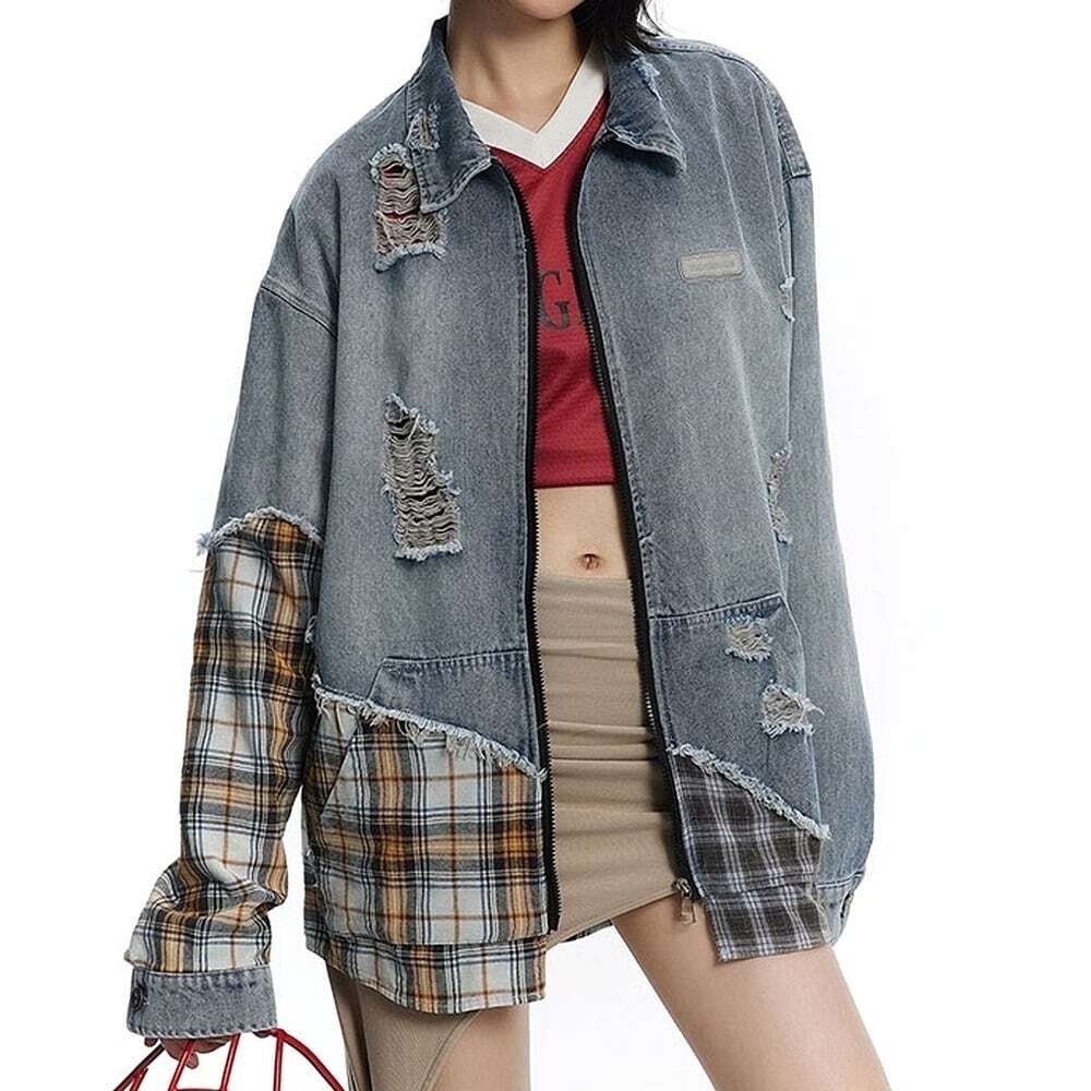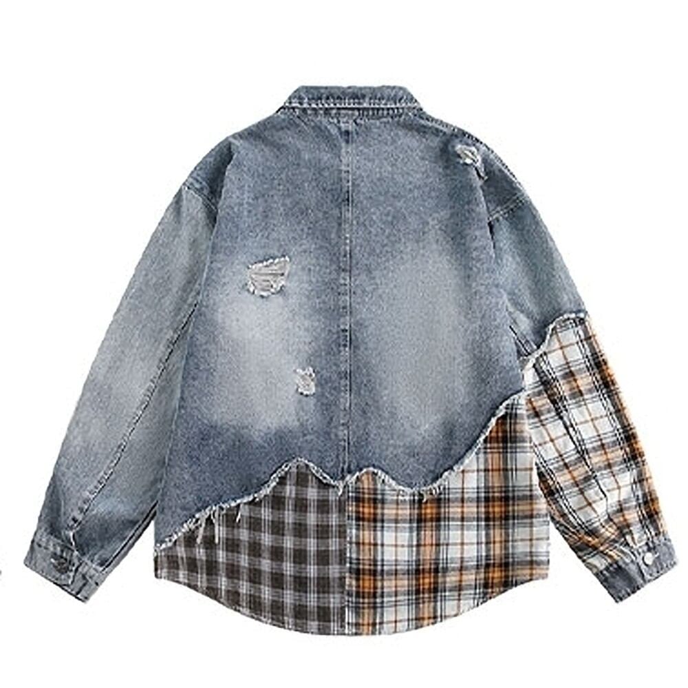 レトロなチェック柄 × ダメージデニムがドッキングしたジップアップデニムジャケット。