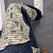 大胆なパッチワークデザインが特徴のデニムジーンズです。
