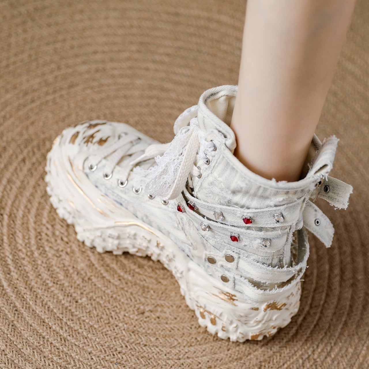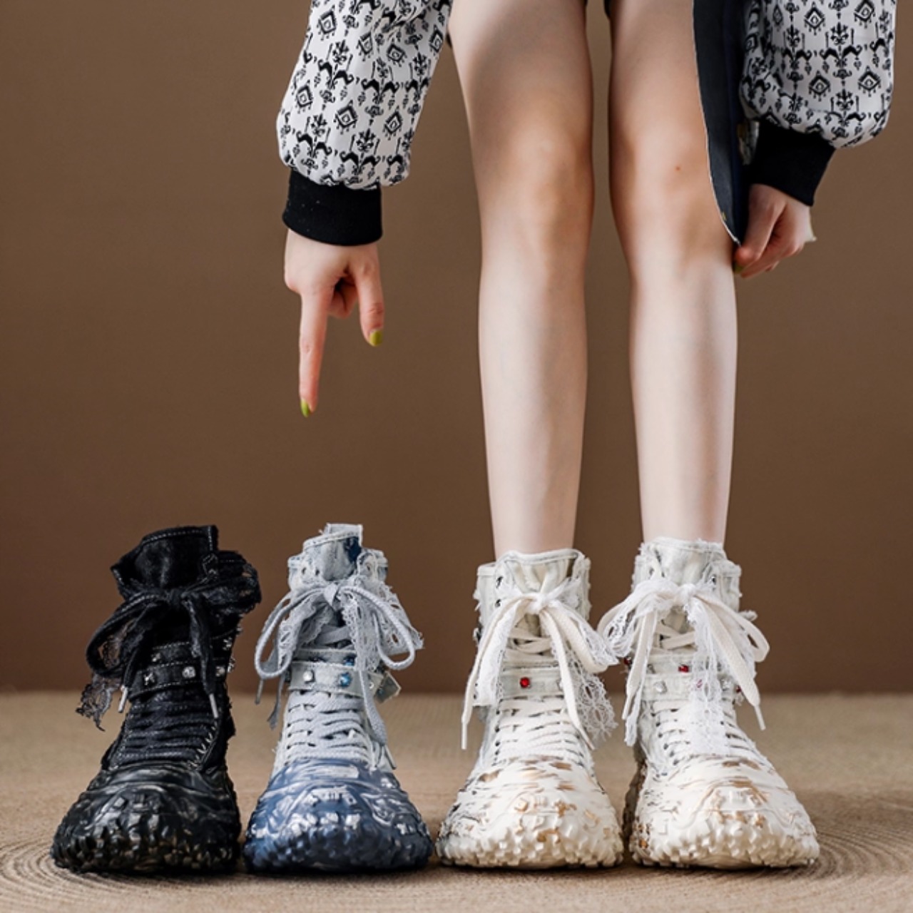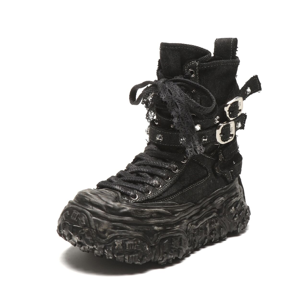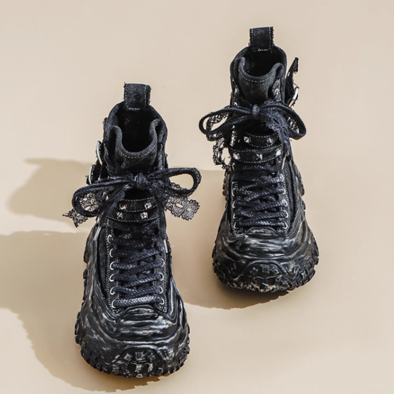 レースアップスタイルが足元を引き立て、個性的な印象を与える一品です。
