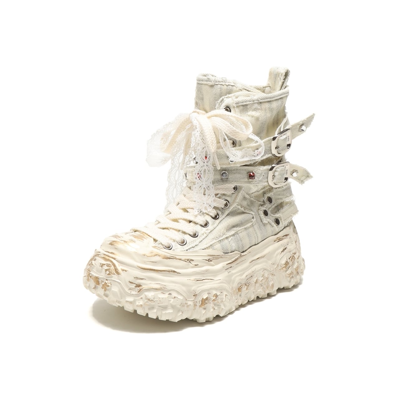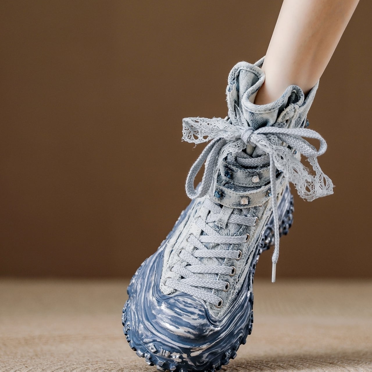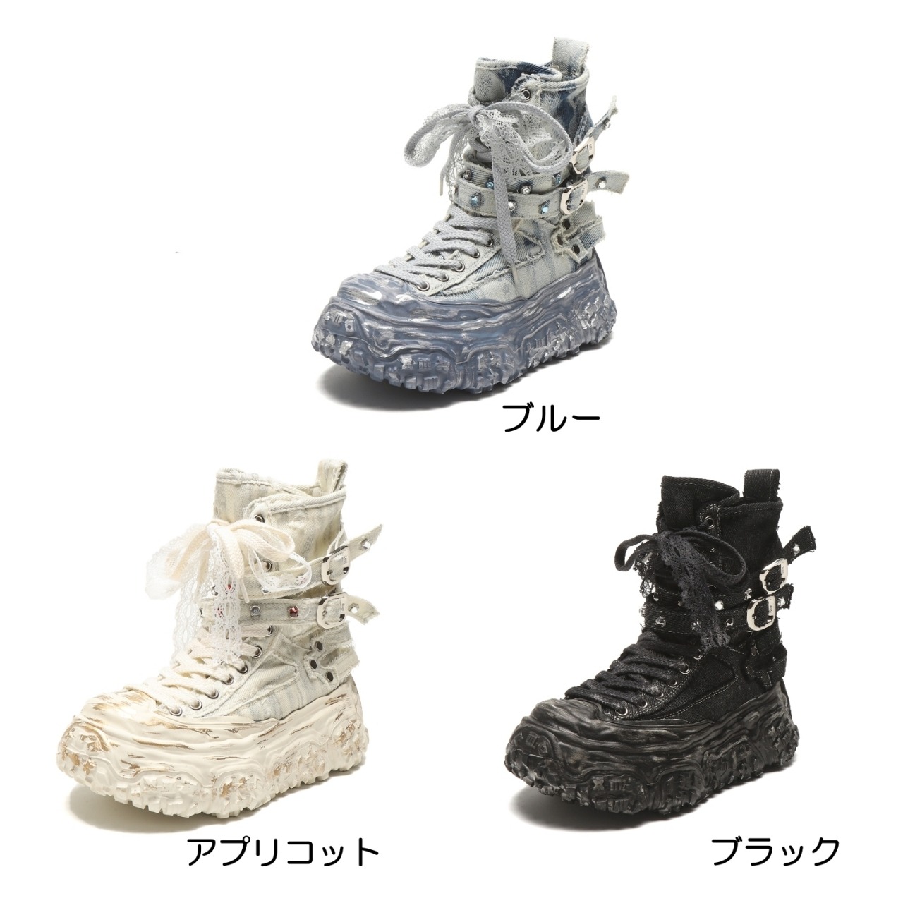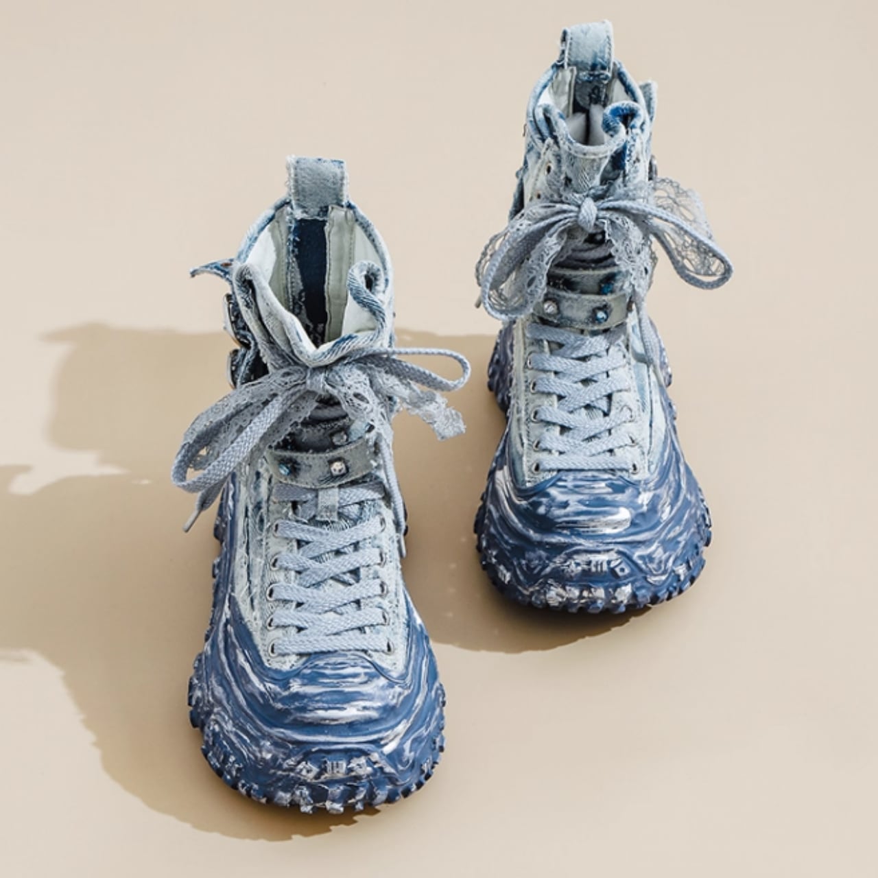 レースアップスタイルが足元を引き立て、個性的な印象を与える一品です。