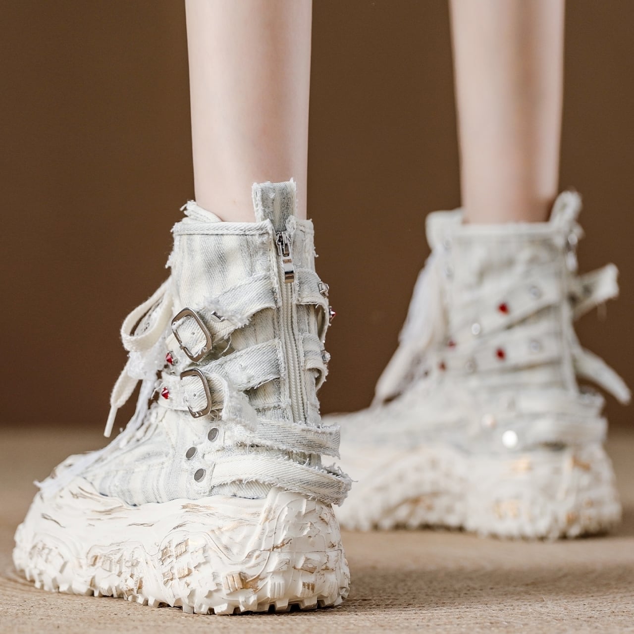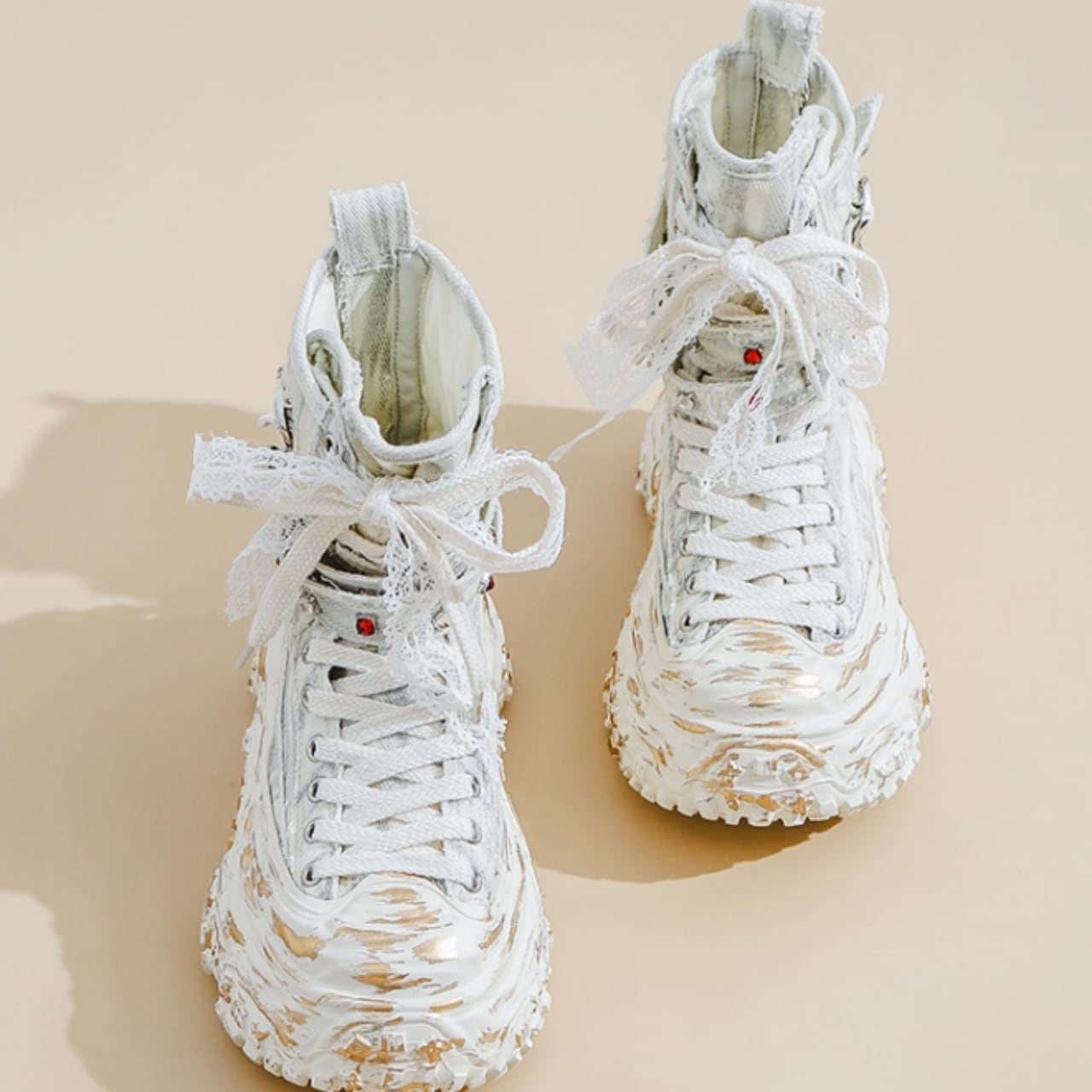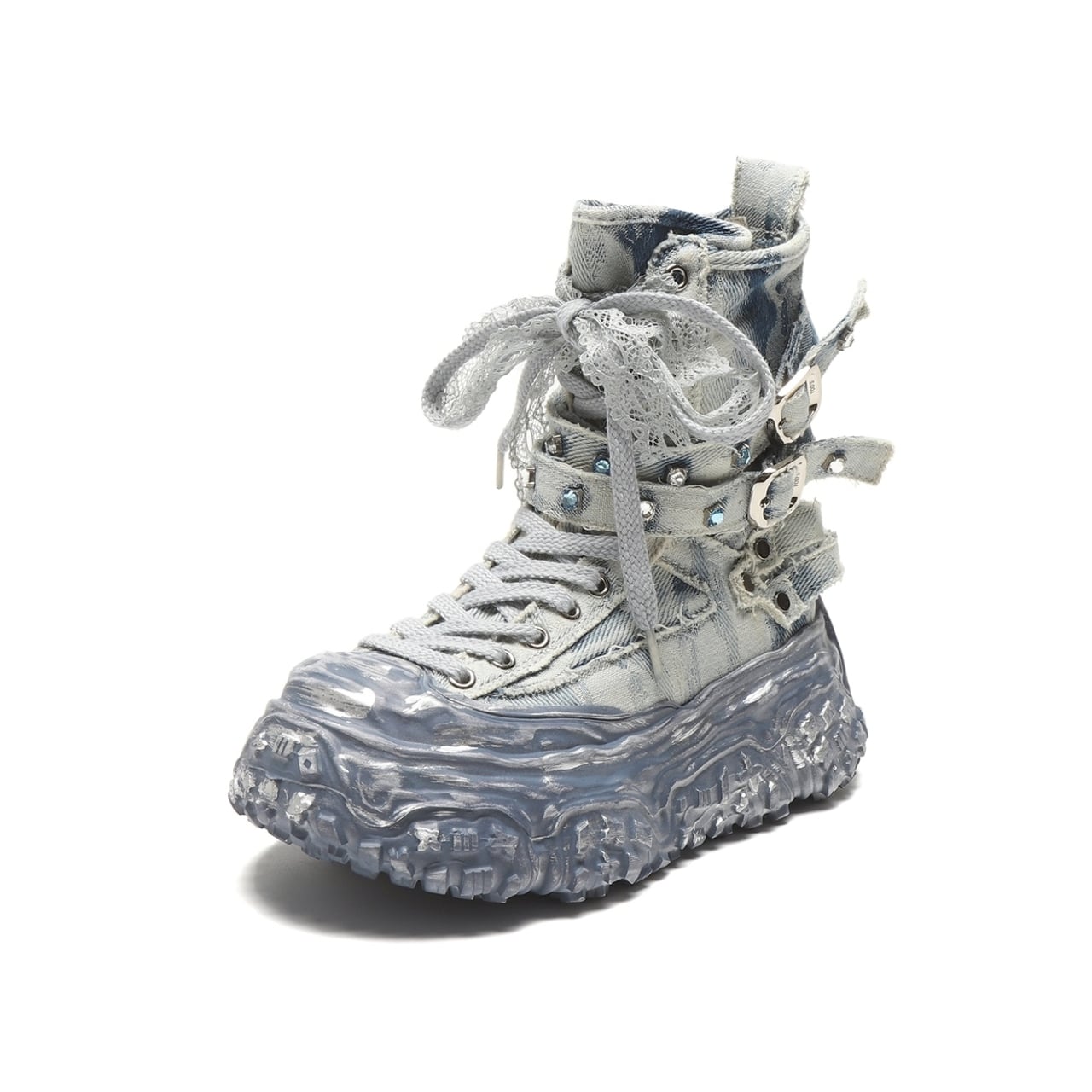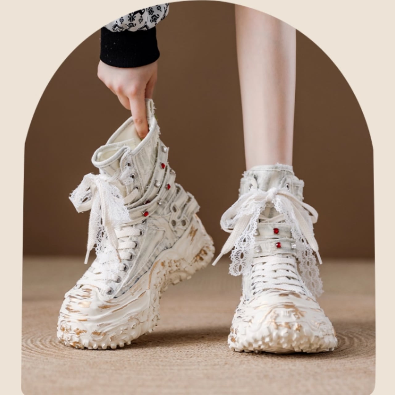 レースアップスタイルが足元を引き立て、個性的な印象を与える一品です。