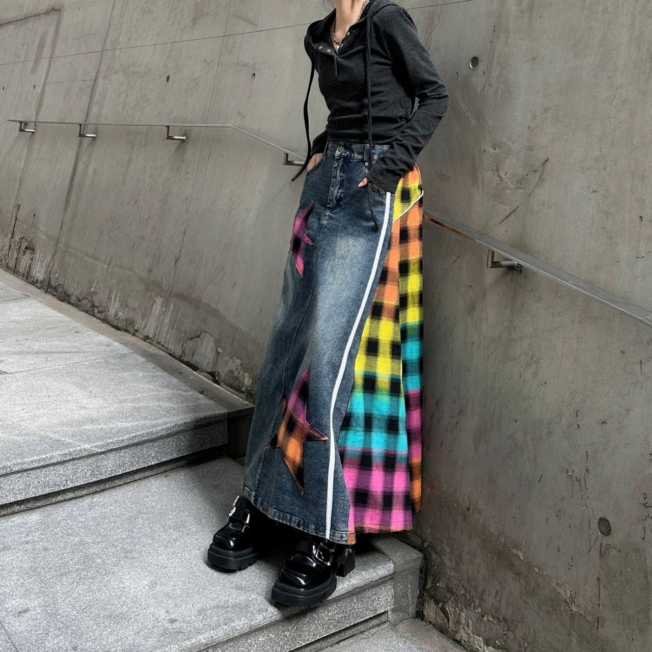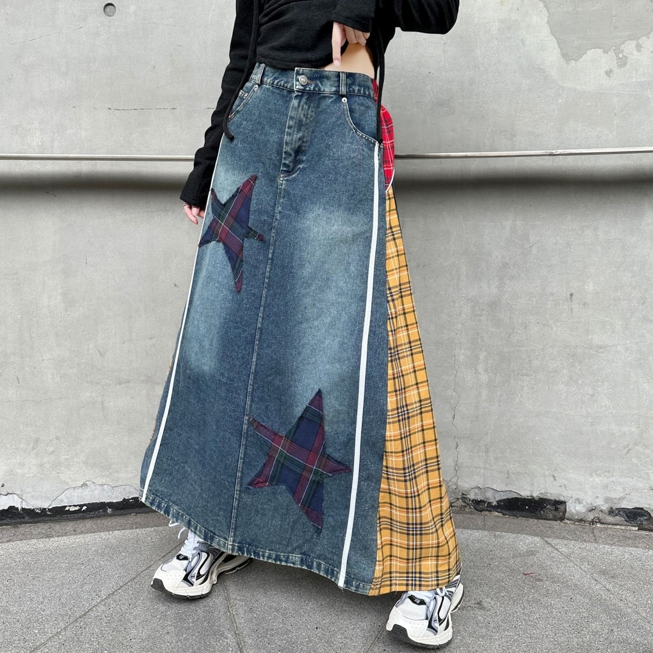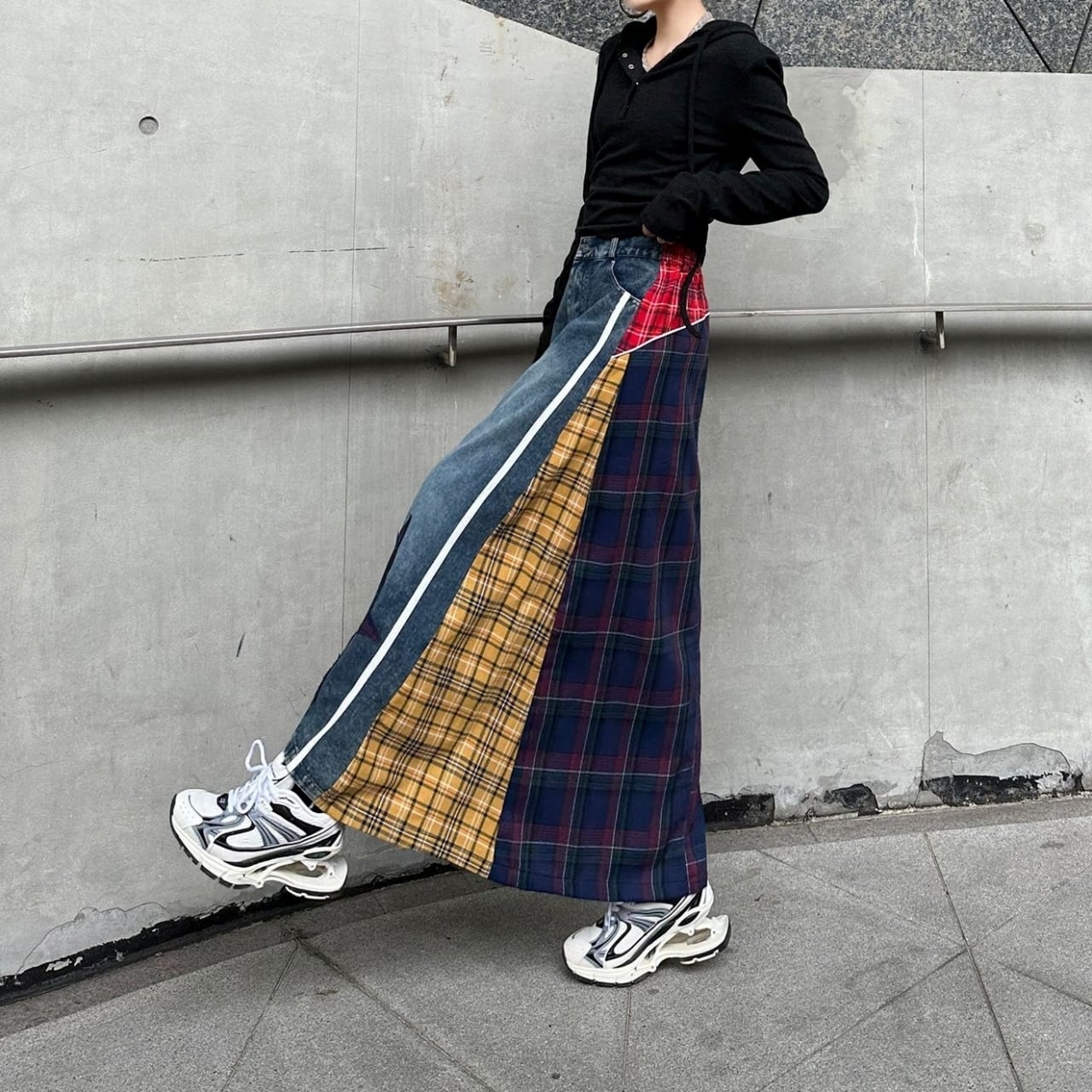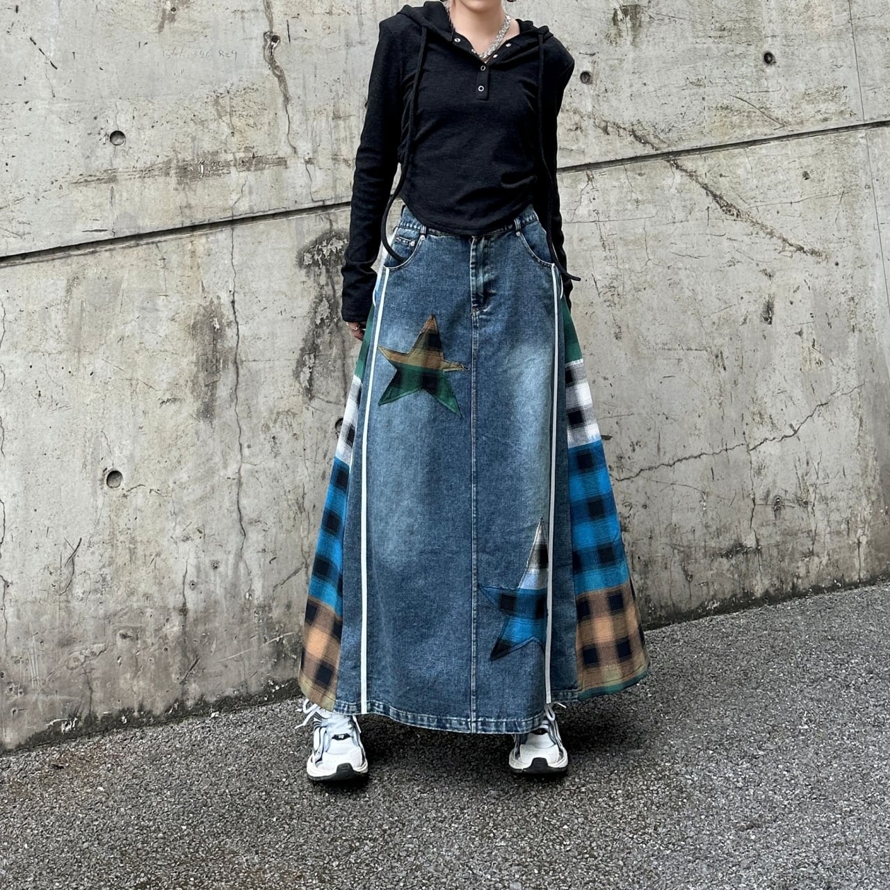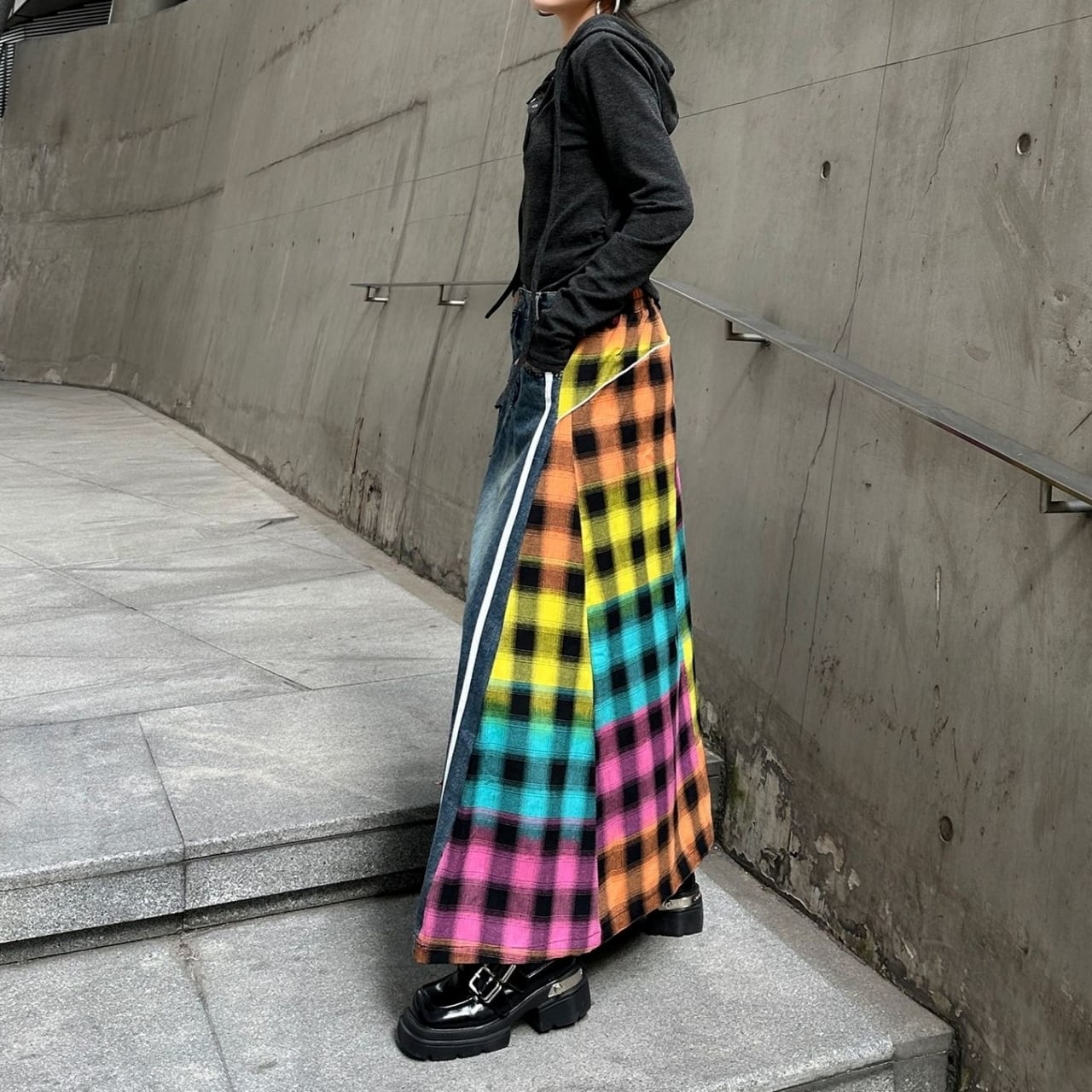 チェック柄とデニムがドッキングしたユニークなデザインのロングスカート。