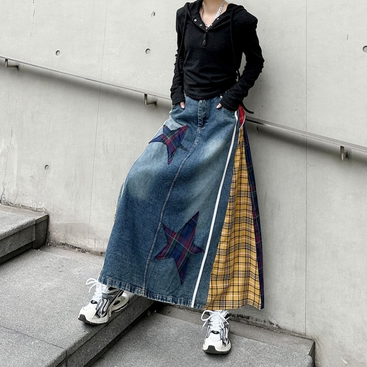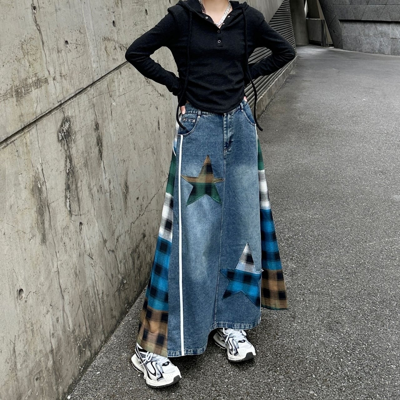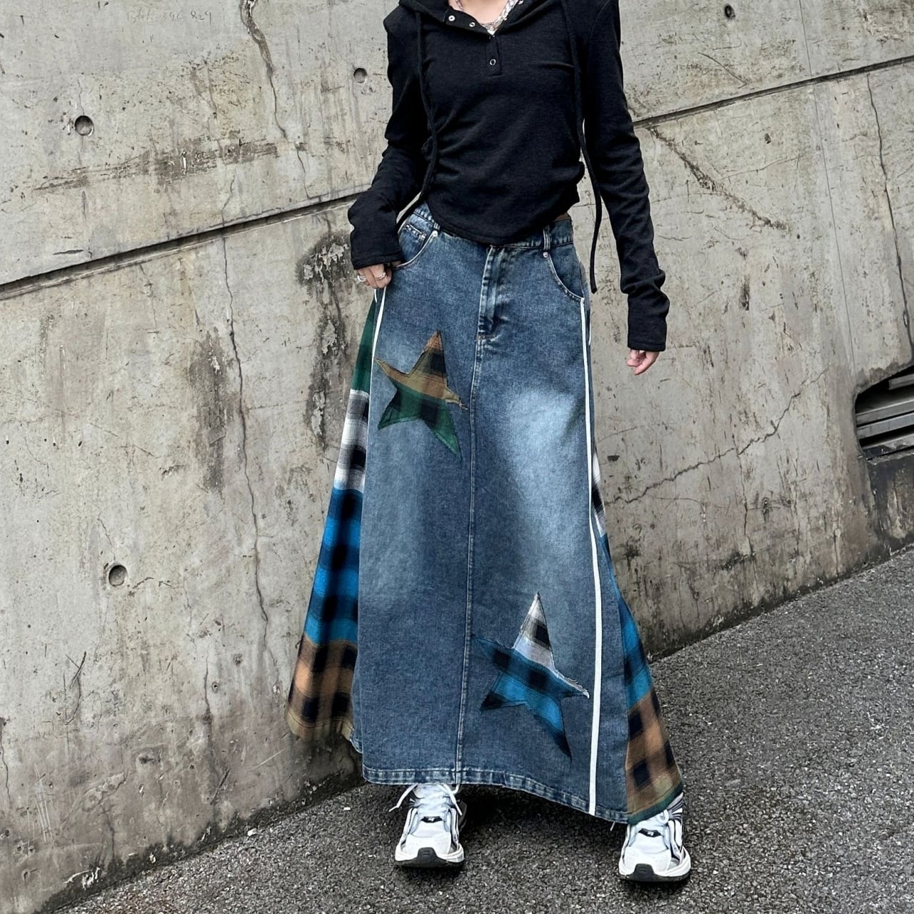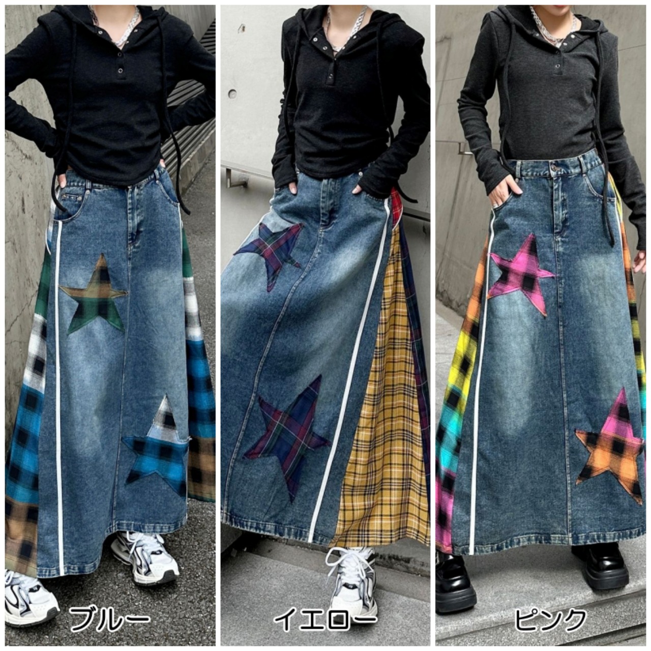 チェック柄とデニムがドッキングしたユニークなデザインのロングスカート。