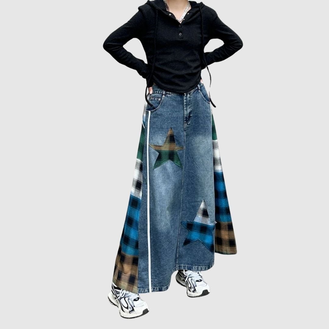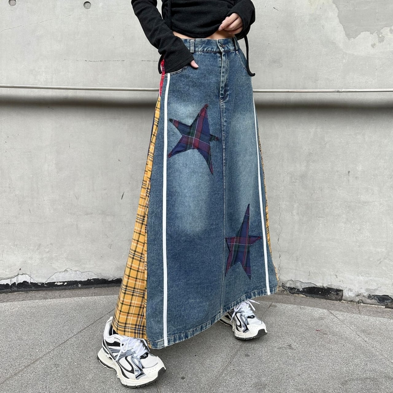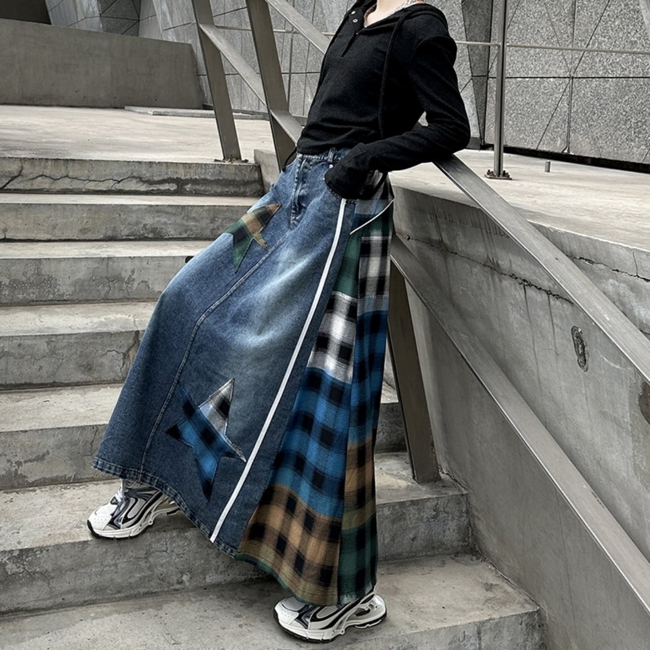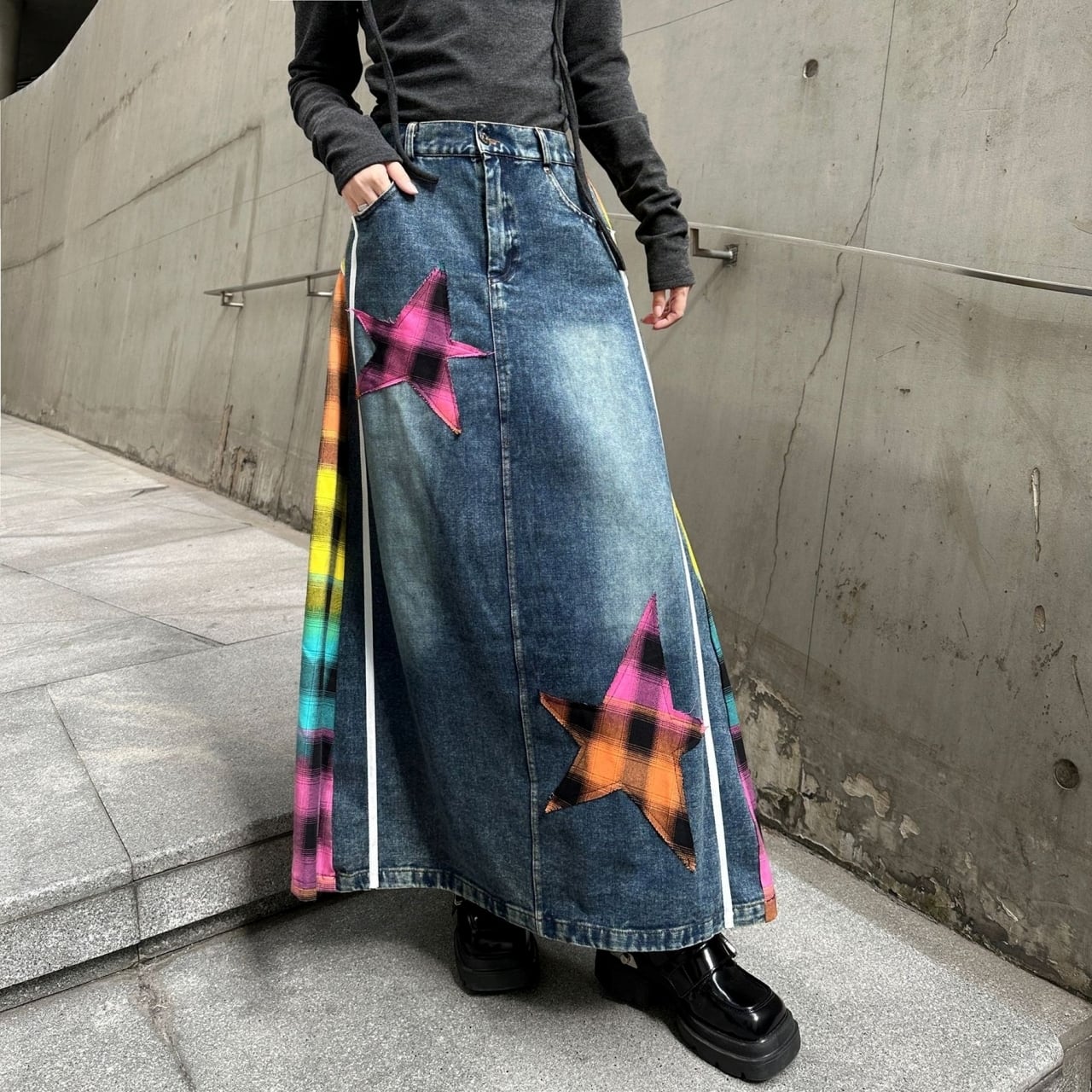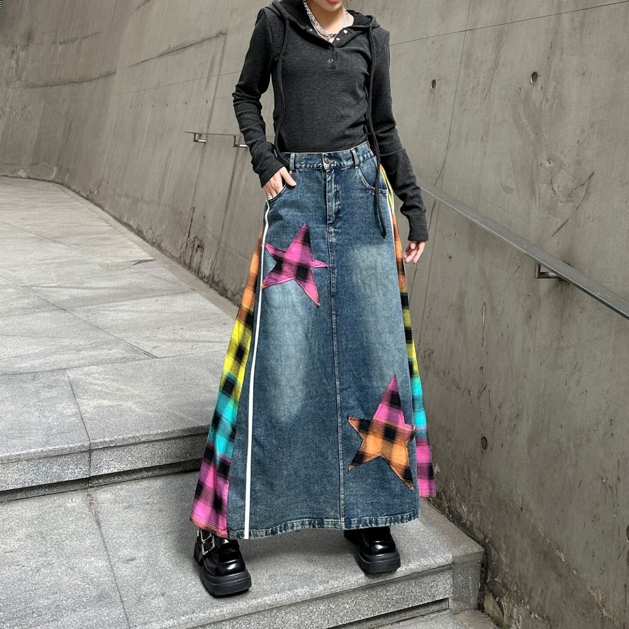 チェック柄とデニムがドッキングしたユニークなデザインのロングスカート。