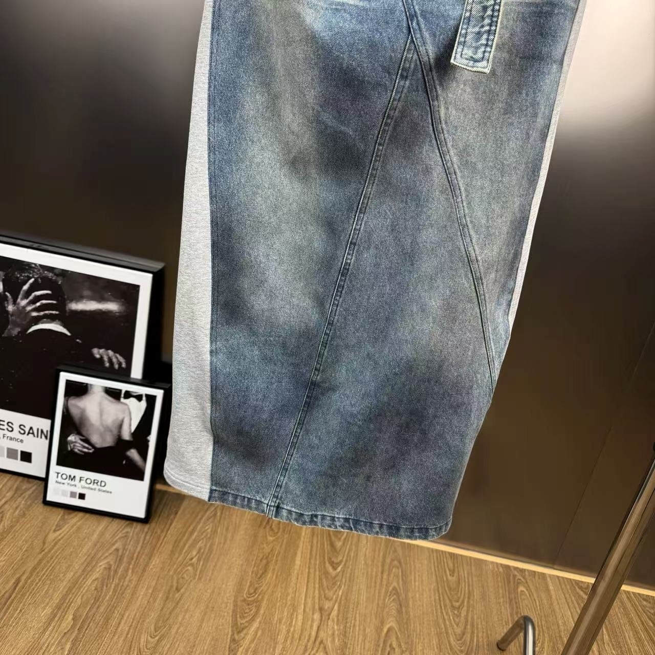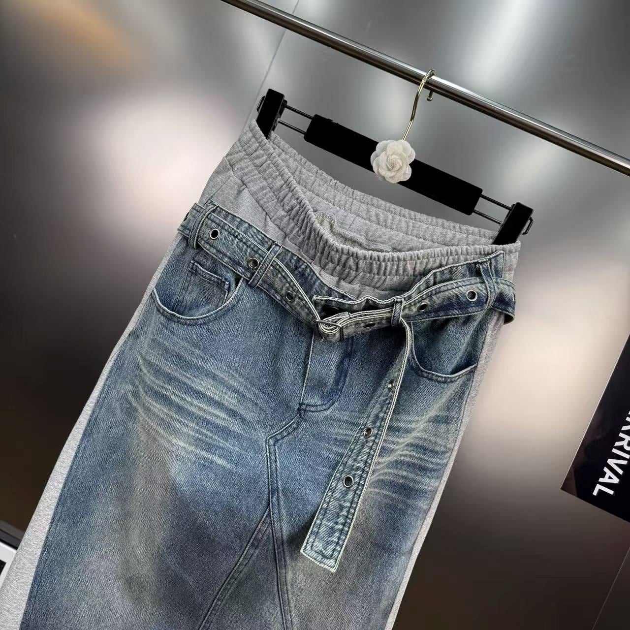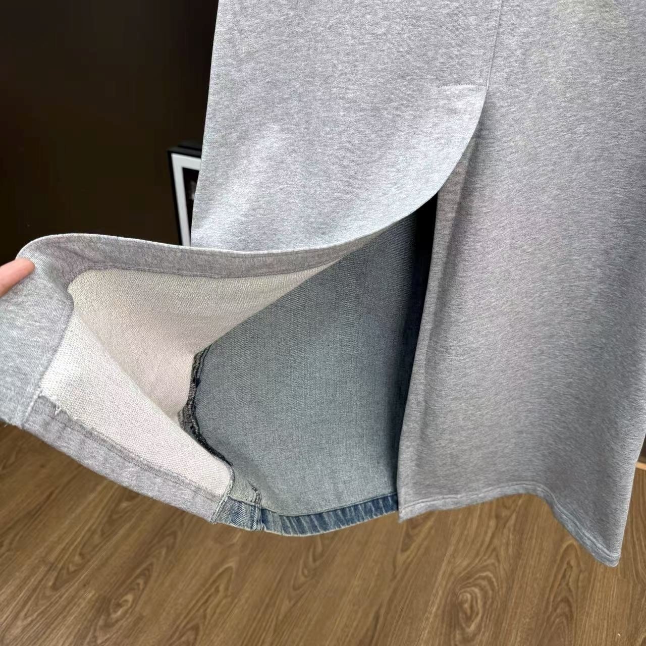 スウェット生地とデニムがドッキングしたユニークなロングスカート。