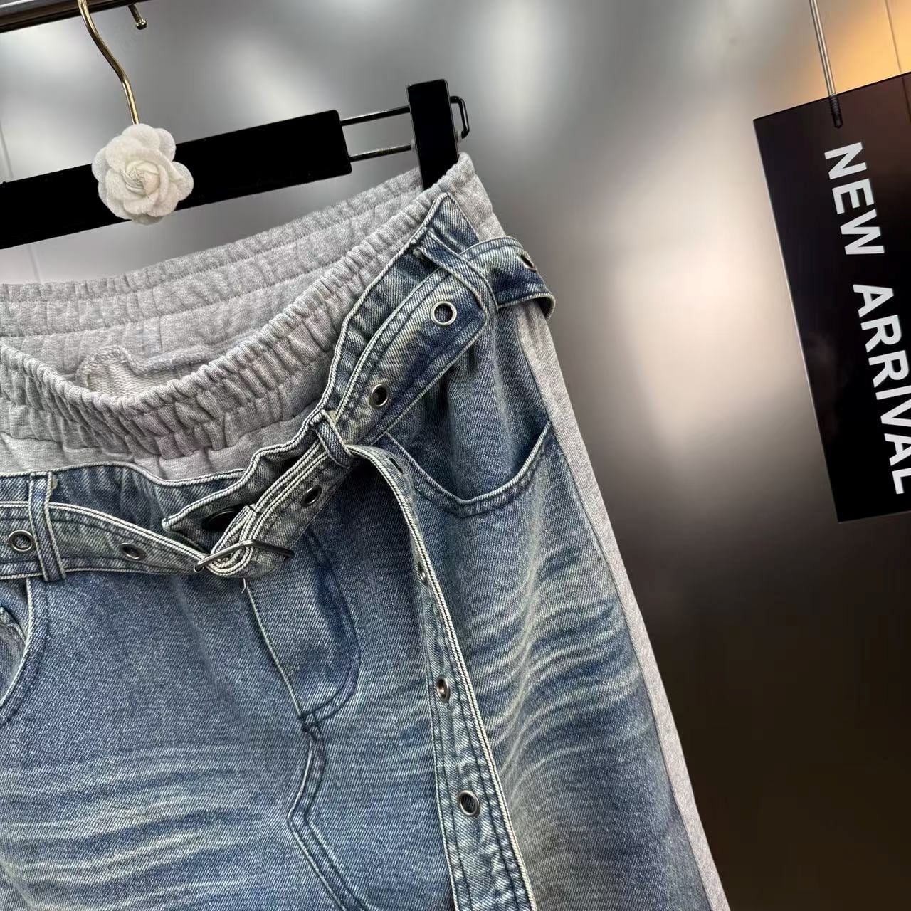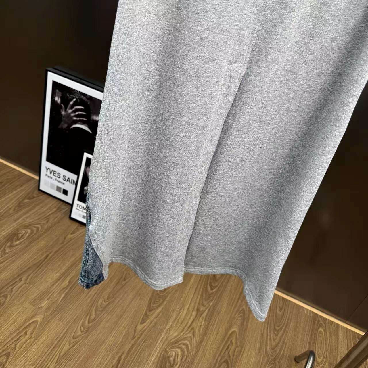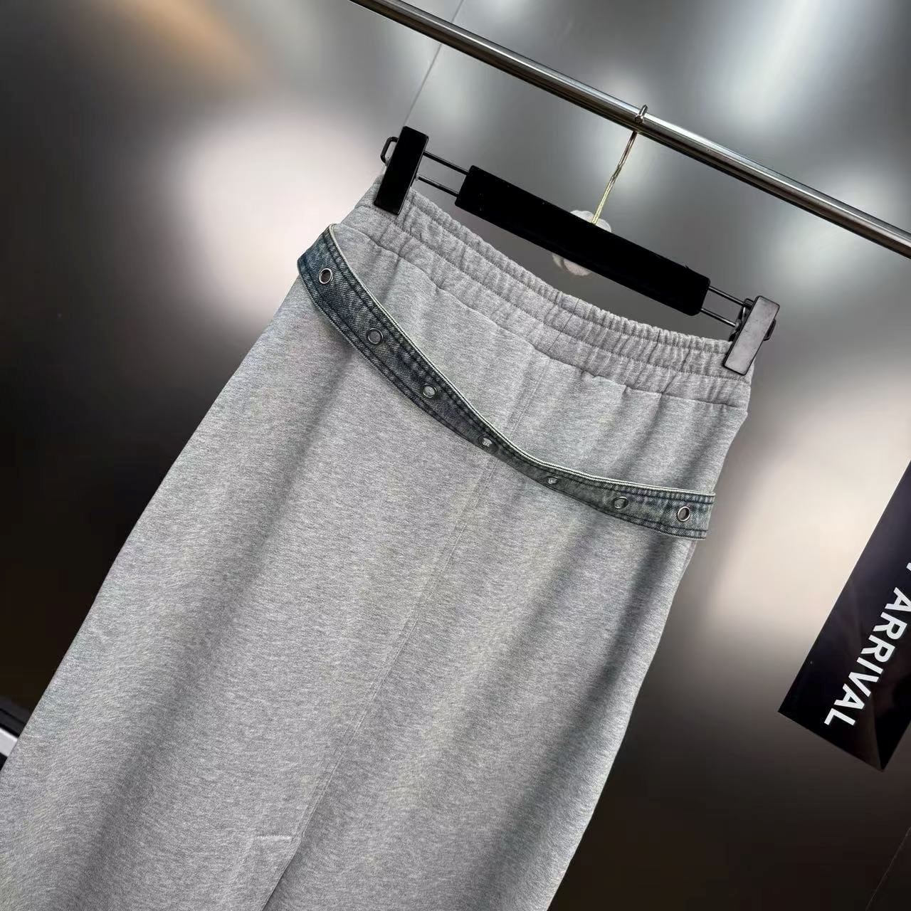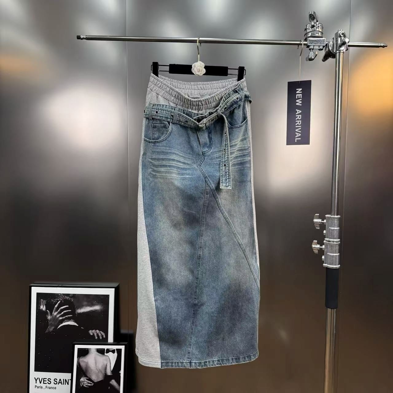 スウェット生地とデニムがドッキングしたユニークなロングスカート。