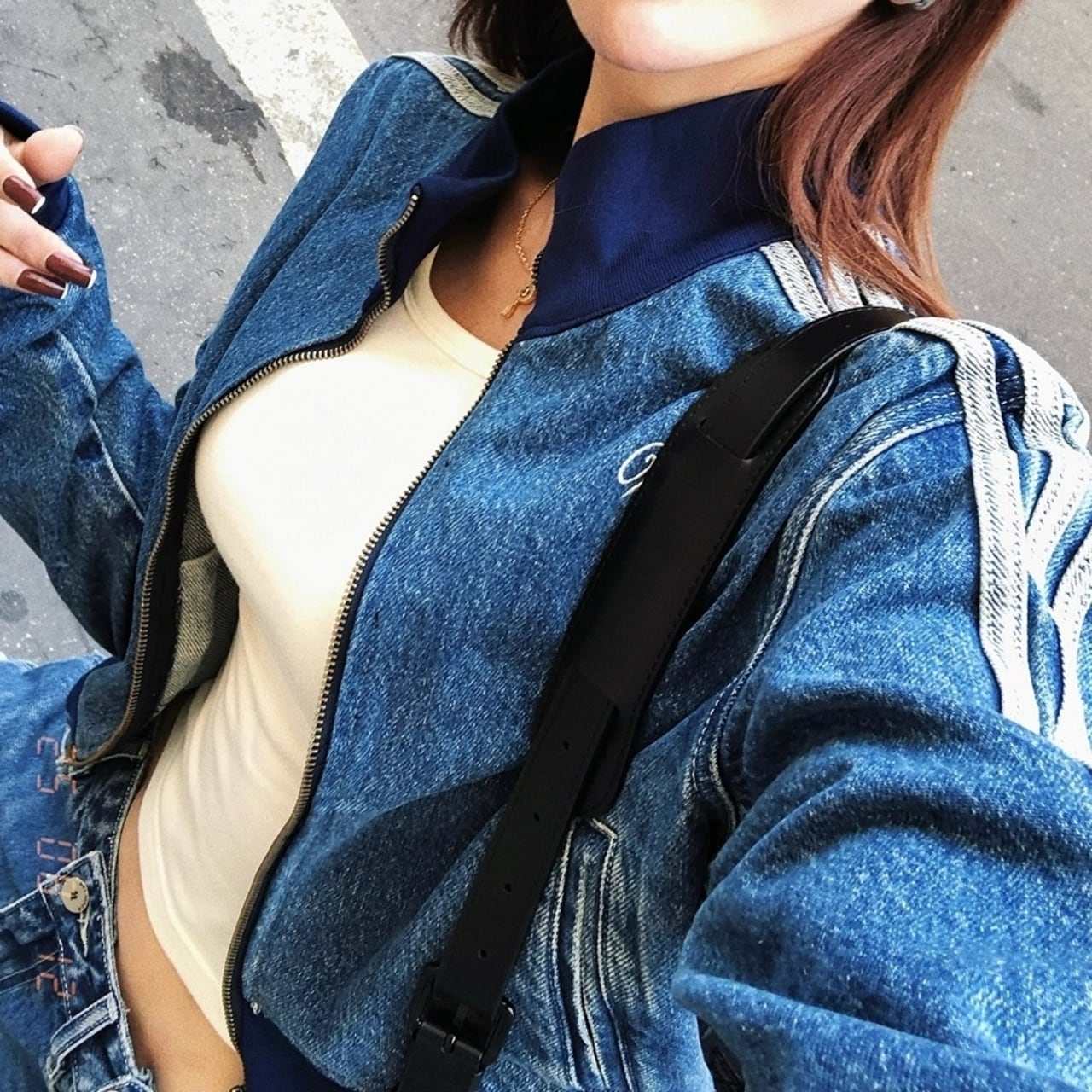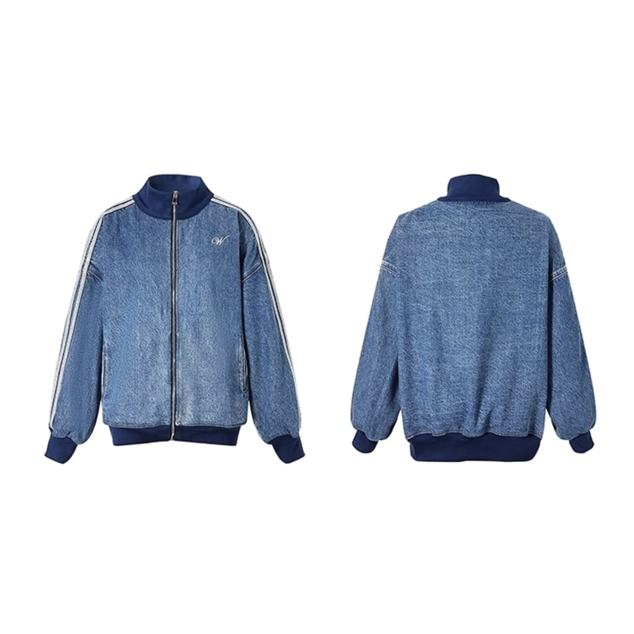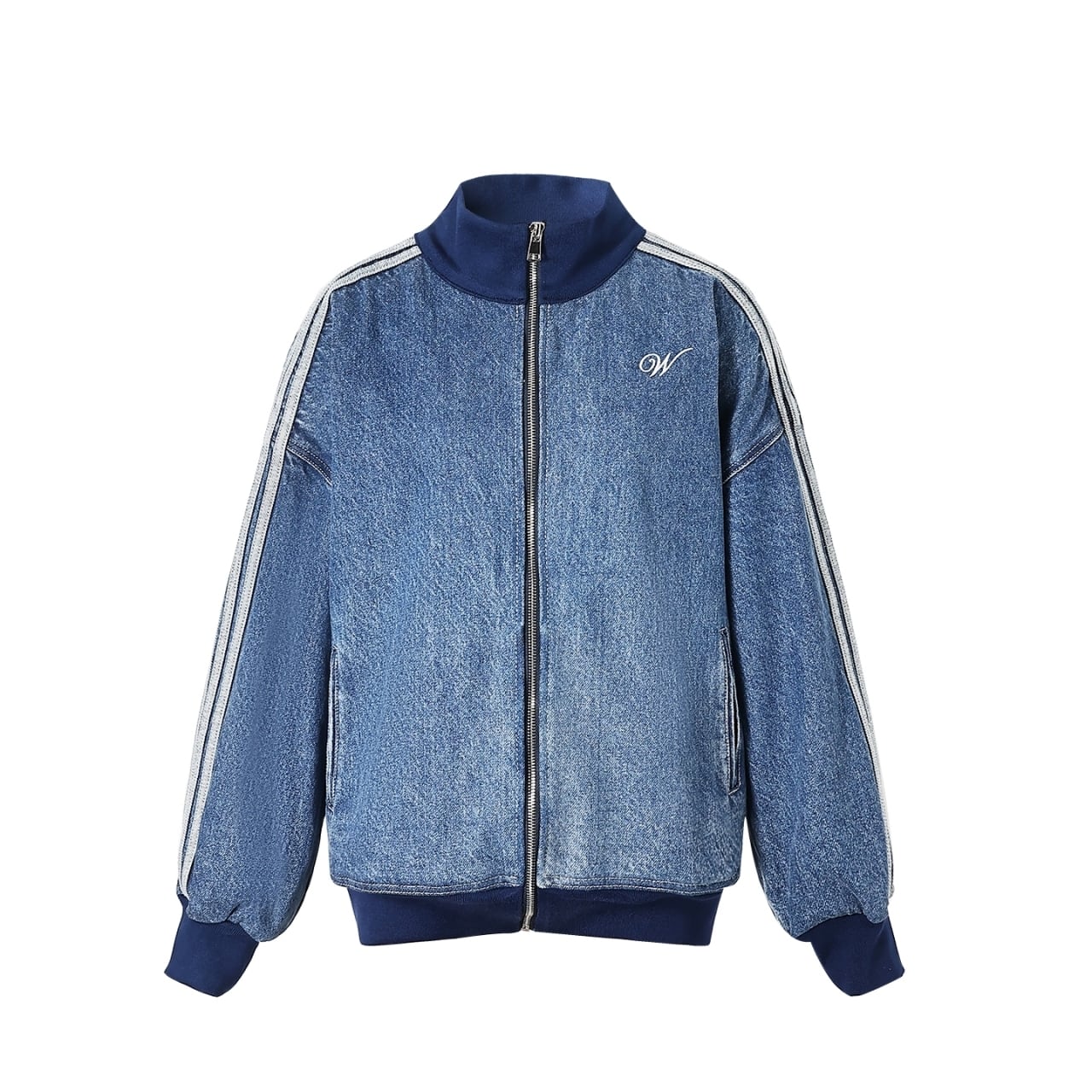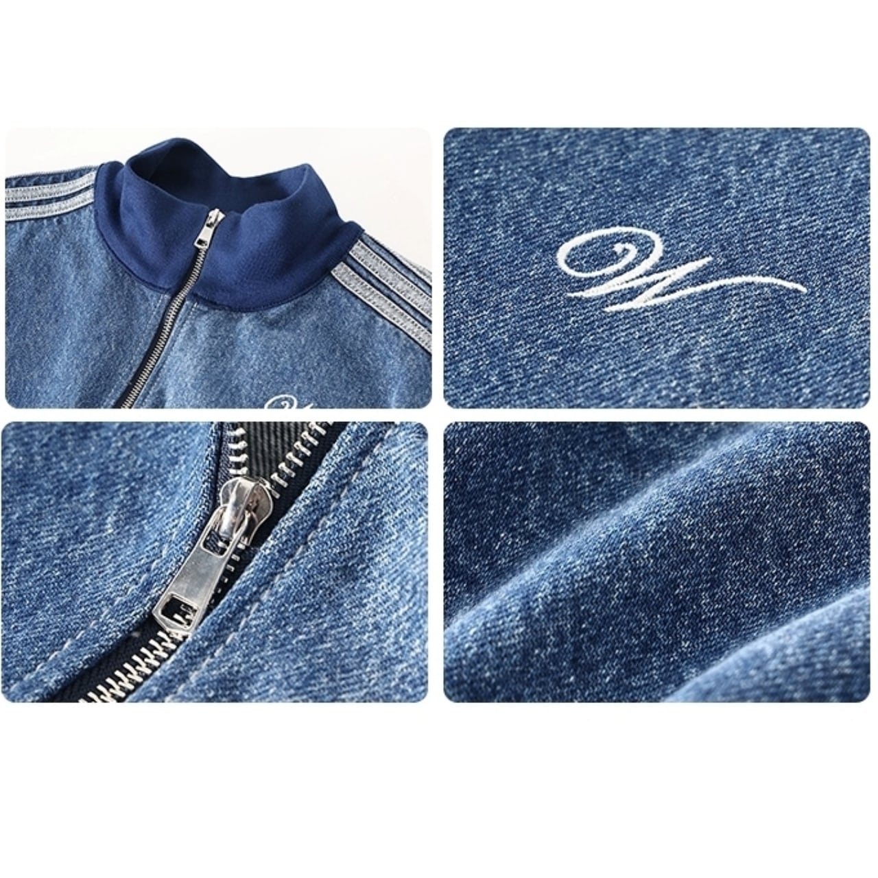 スタンドカラーが特徴的なジップアップデニムジャケット。
