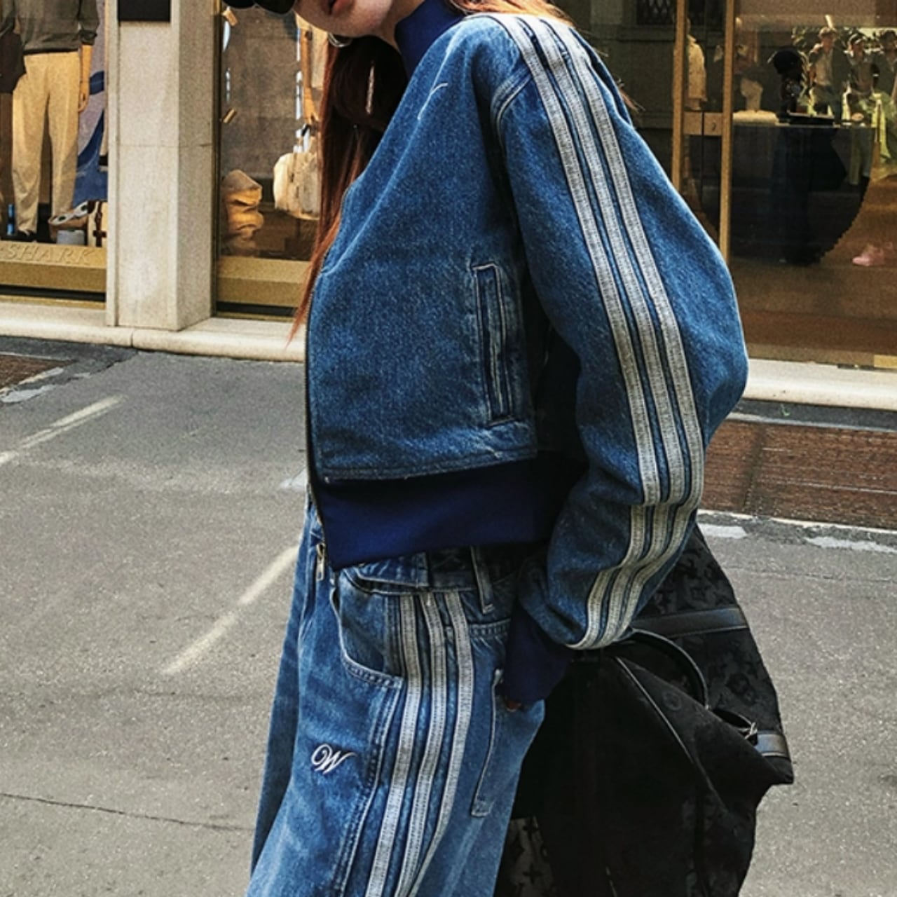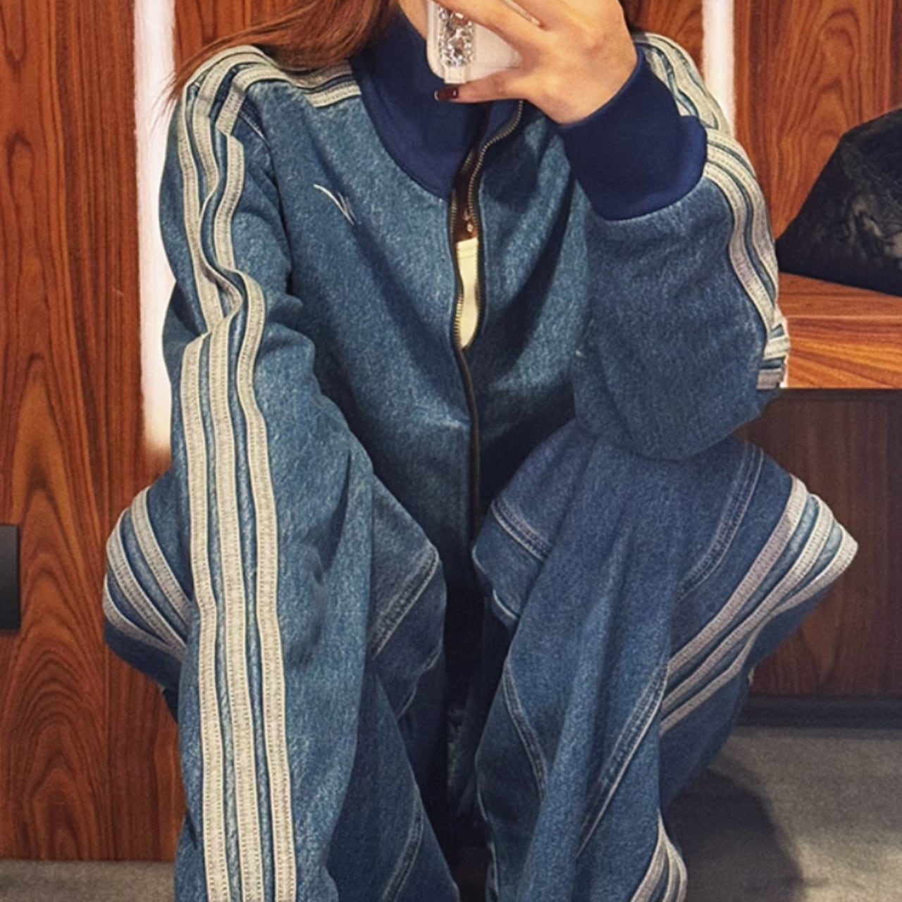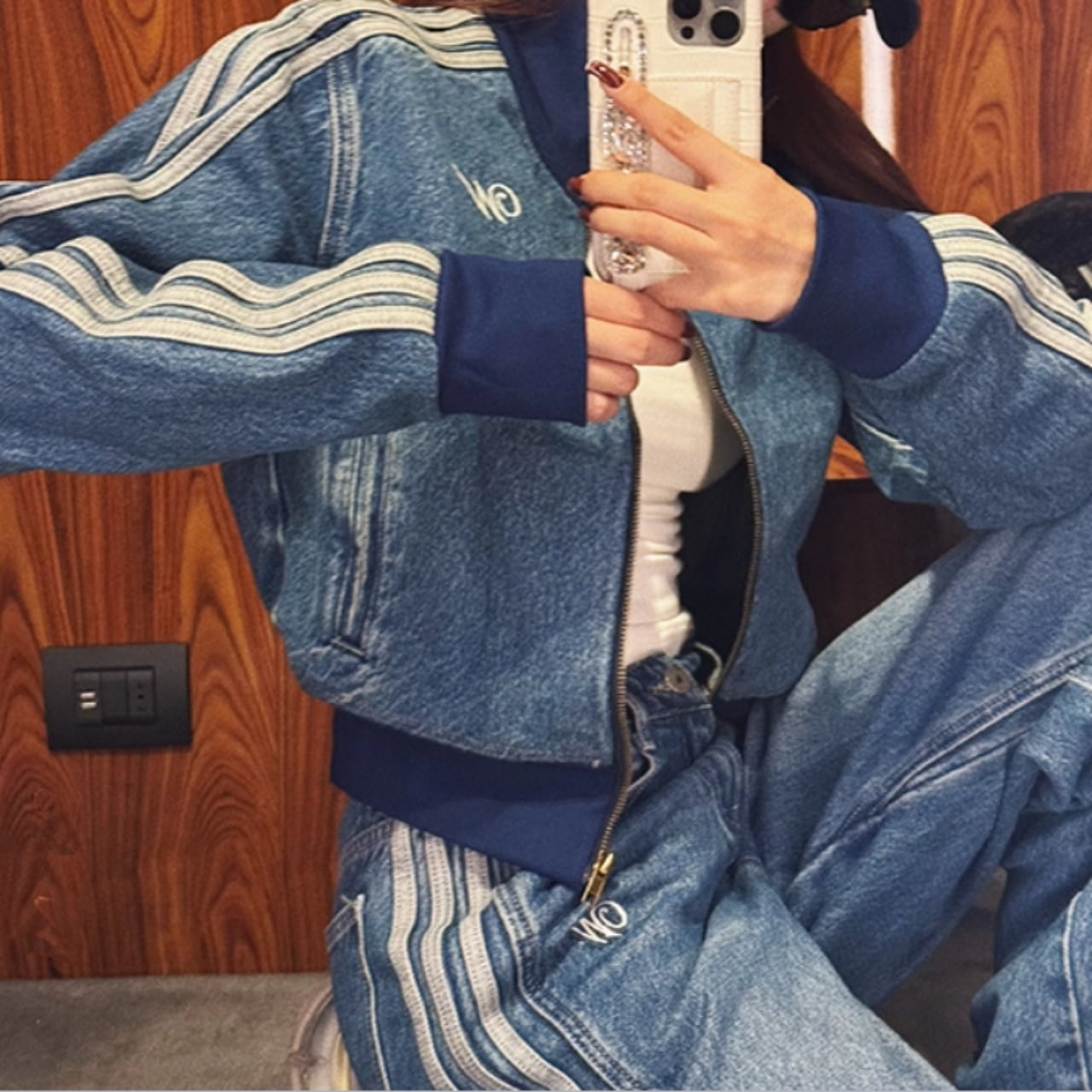 スタンドカラーが特徴的なジップアップデニムジャケット。