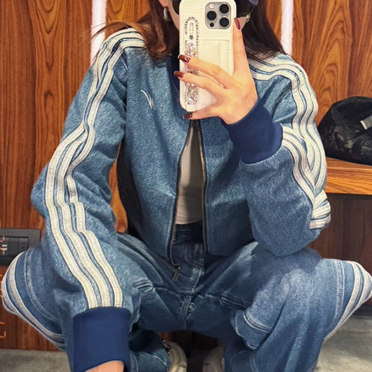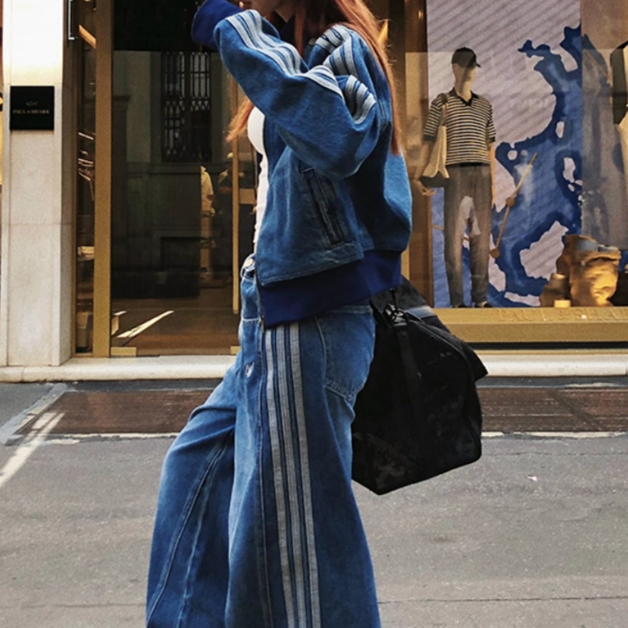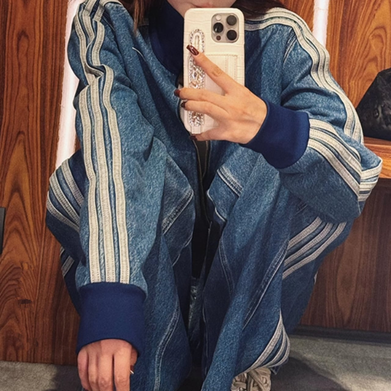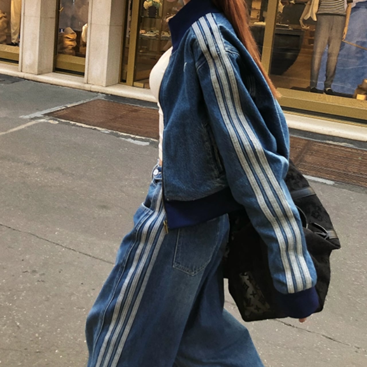 スタンドカラーが特徴的なジップアップデニムジャケット。