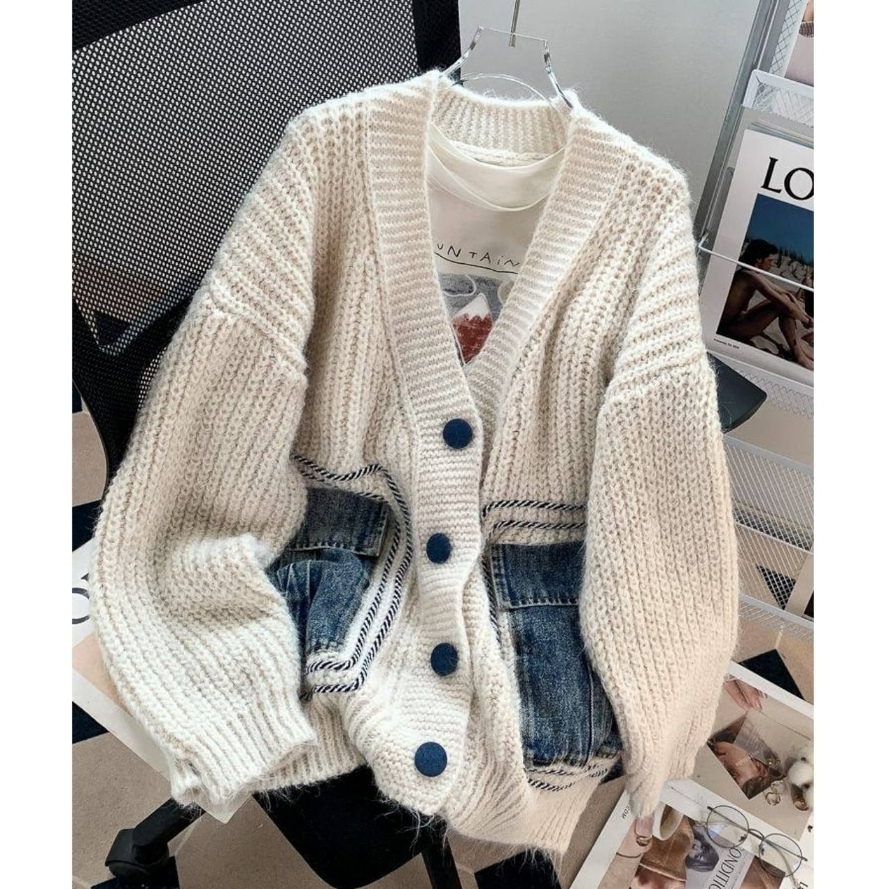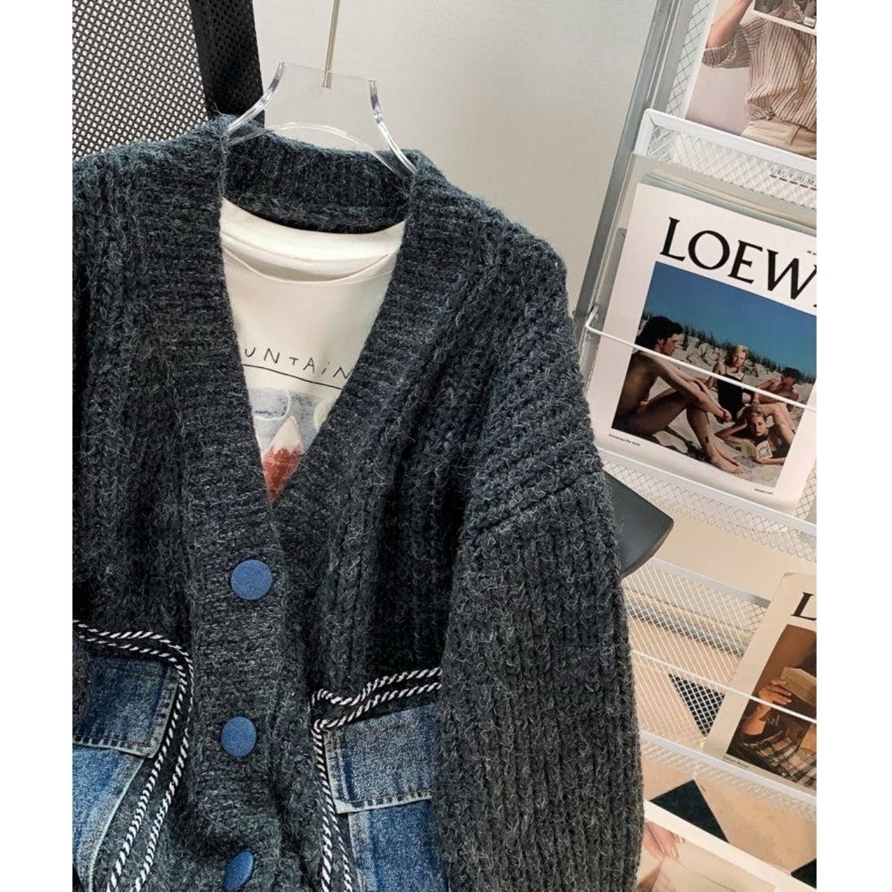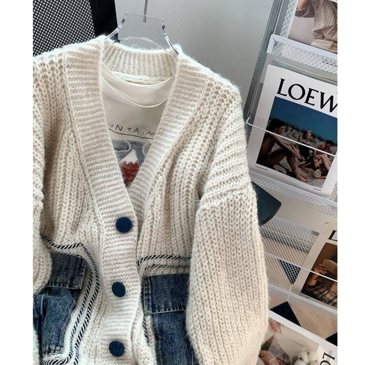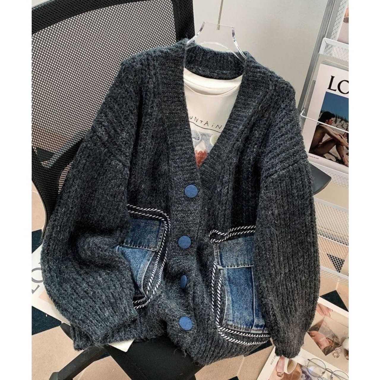 デニム素材のボタンとポケットがアクセントのニットカーディガン。