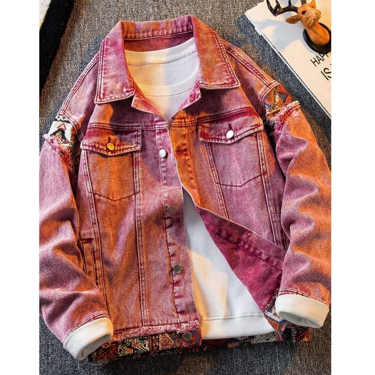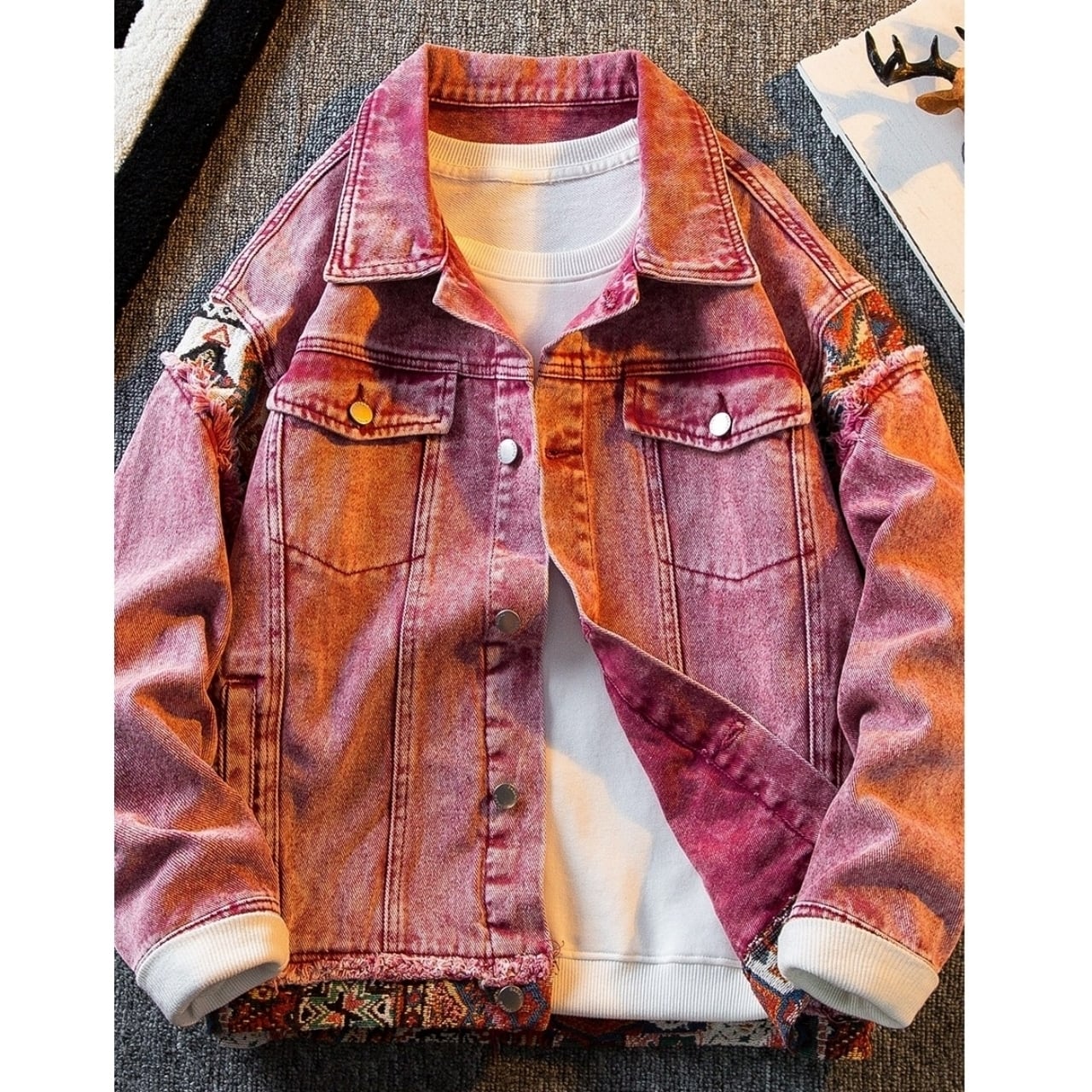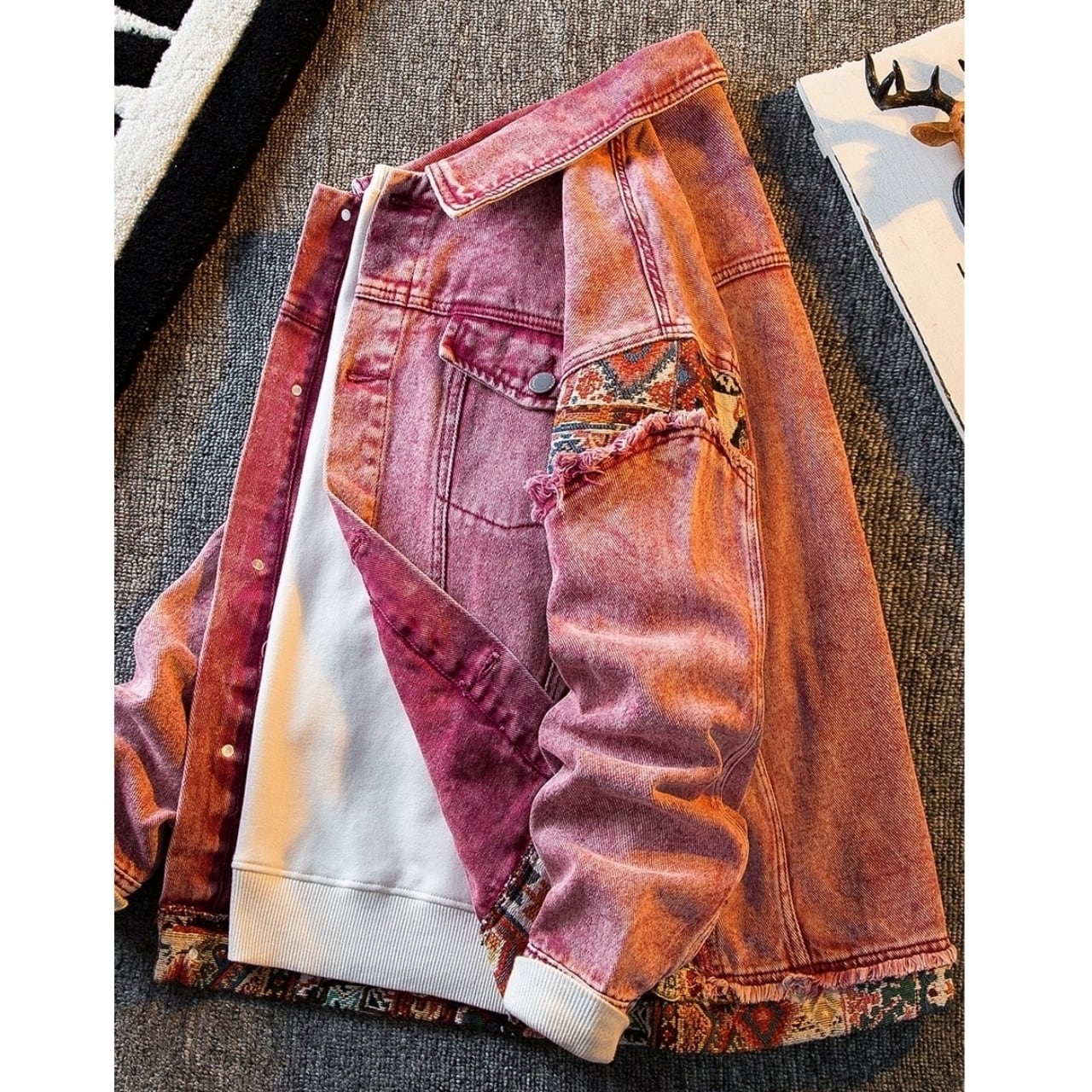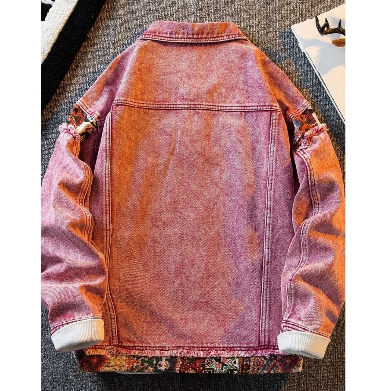 レトロピンクのデニムジャケットにエスニック柄のアクセントが映える一品です。