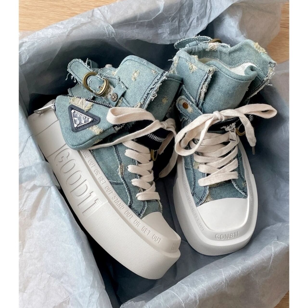 厚底でスタイリッシュな印象を与えるハイカットデニムスニーカー。