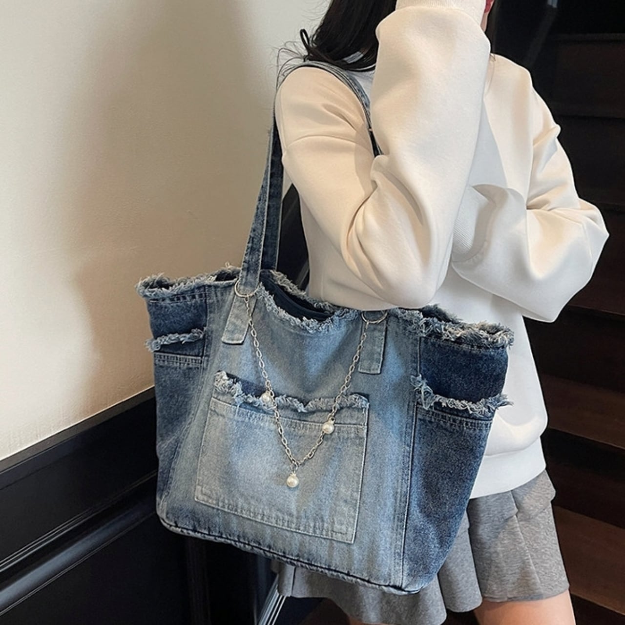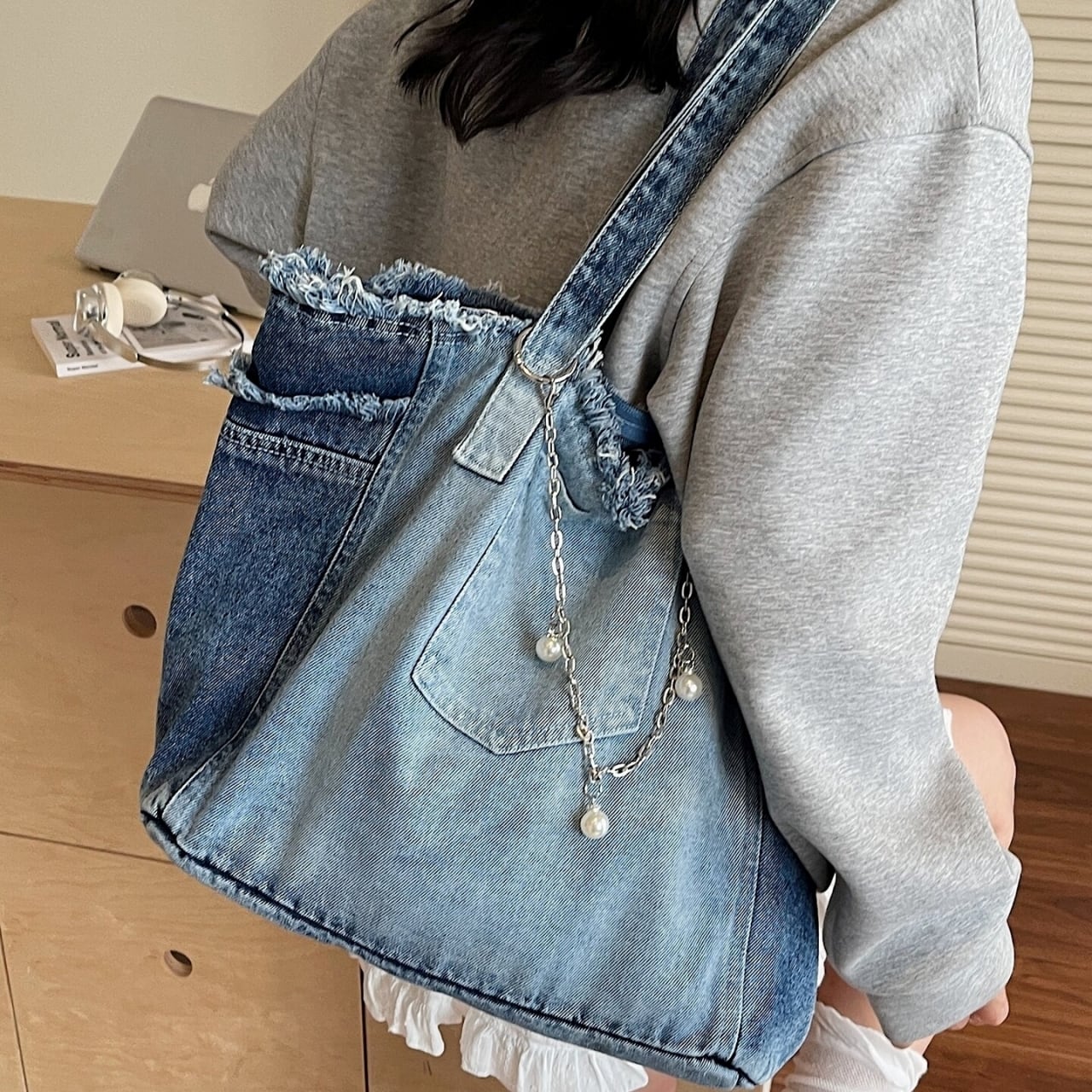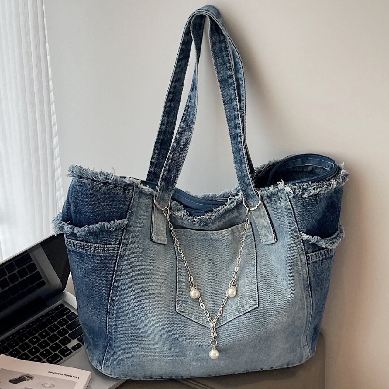 おしゃれで大容量なウォッシュドデニムのトートバッグ。