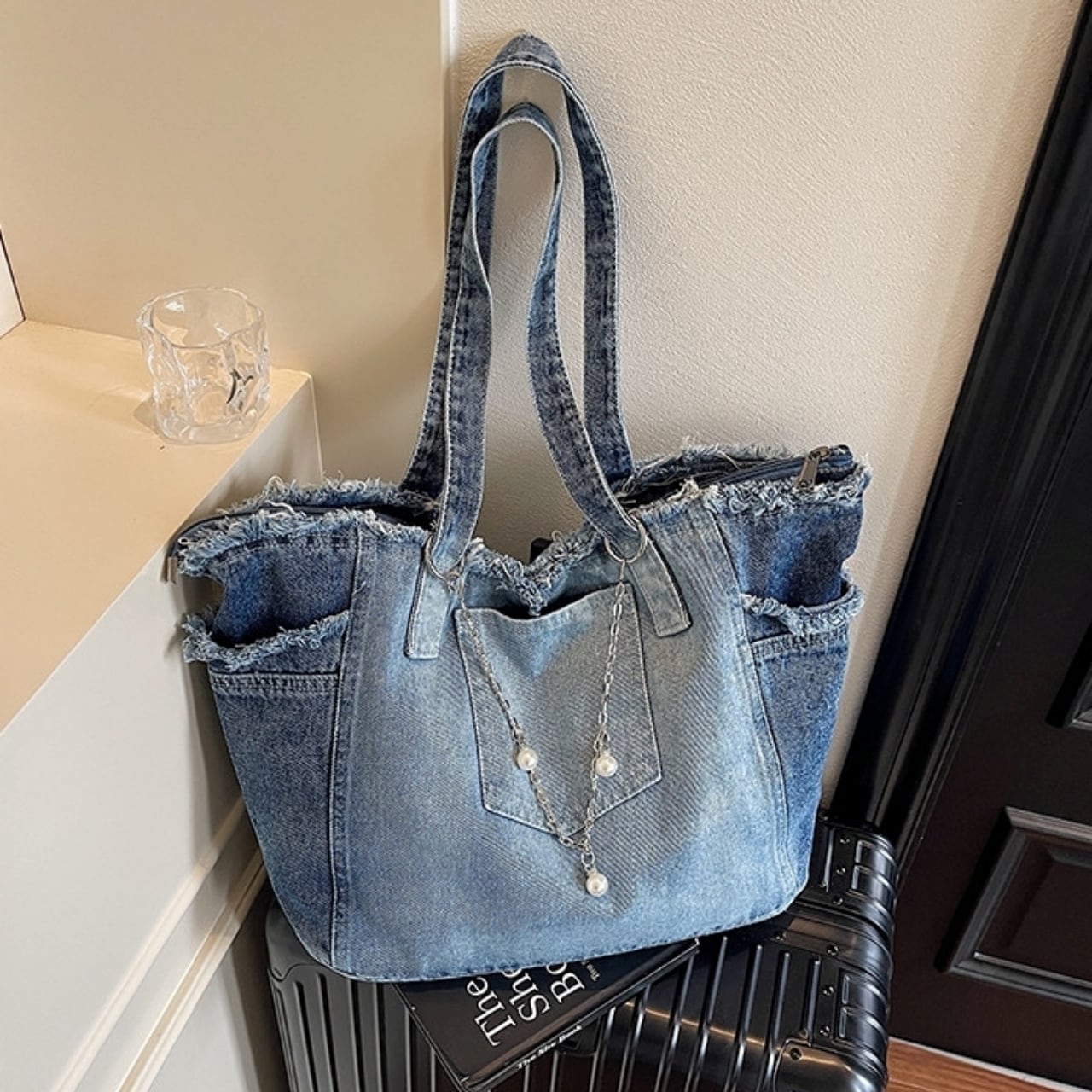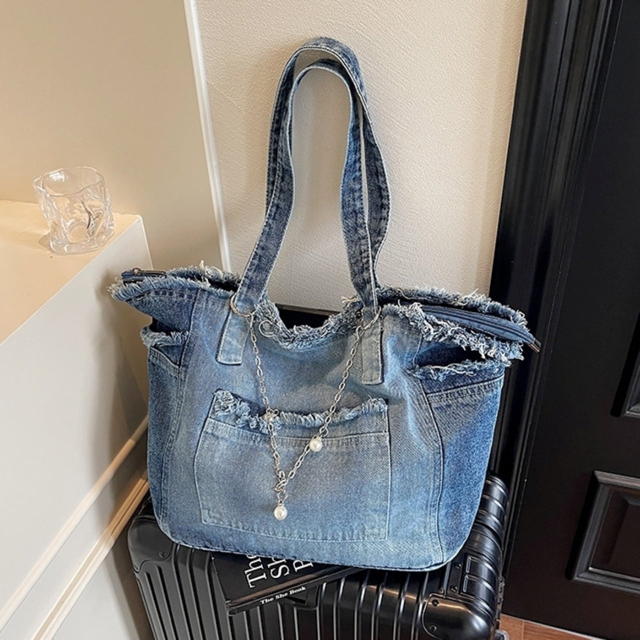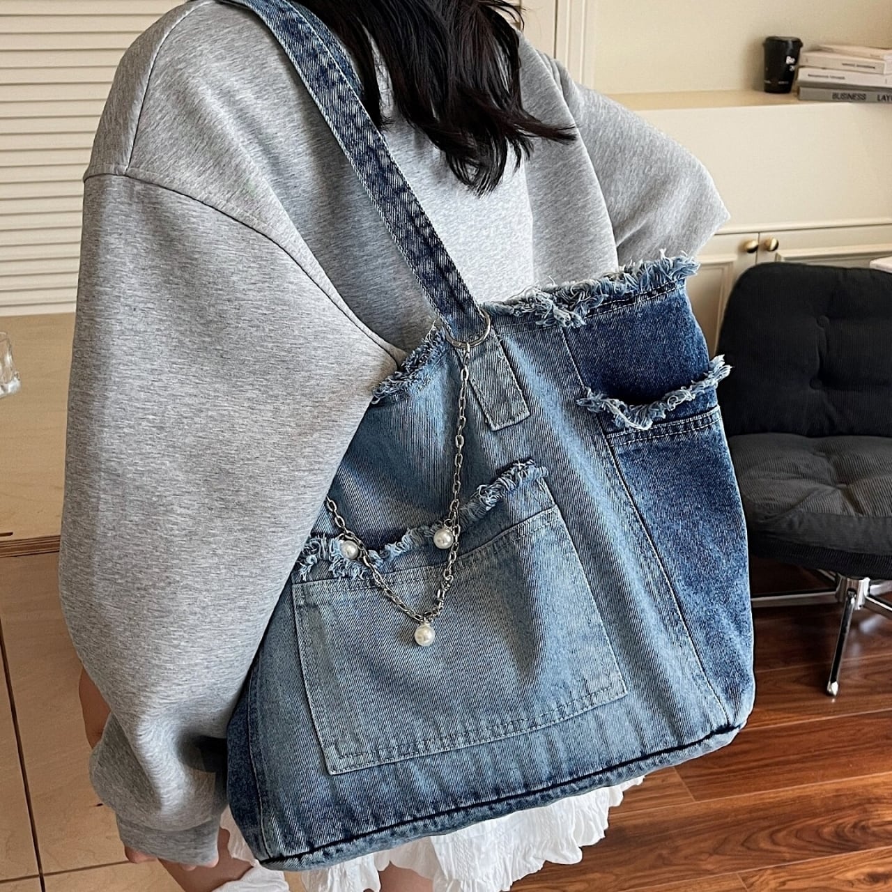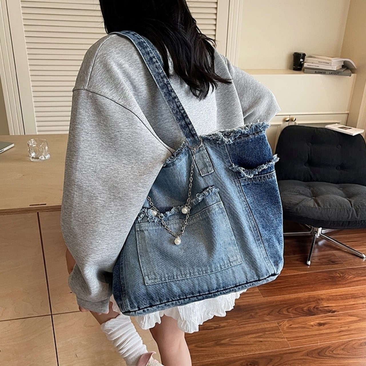 おしゃれで大容量なウォッシュドデニムのトートバッグ。