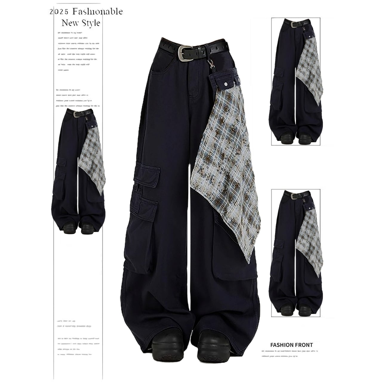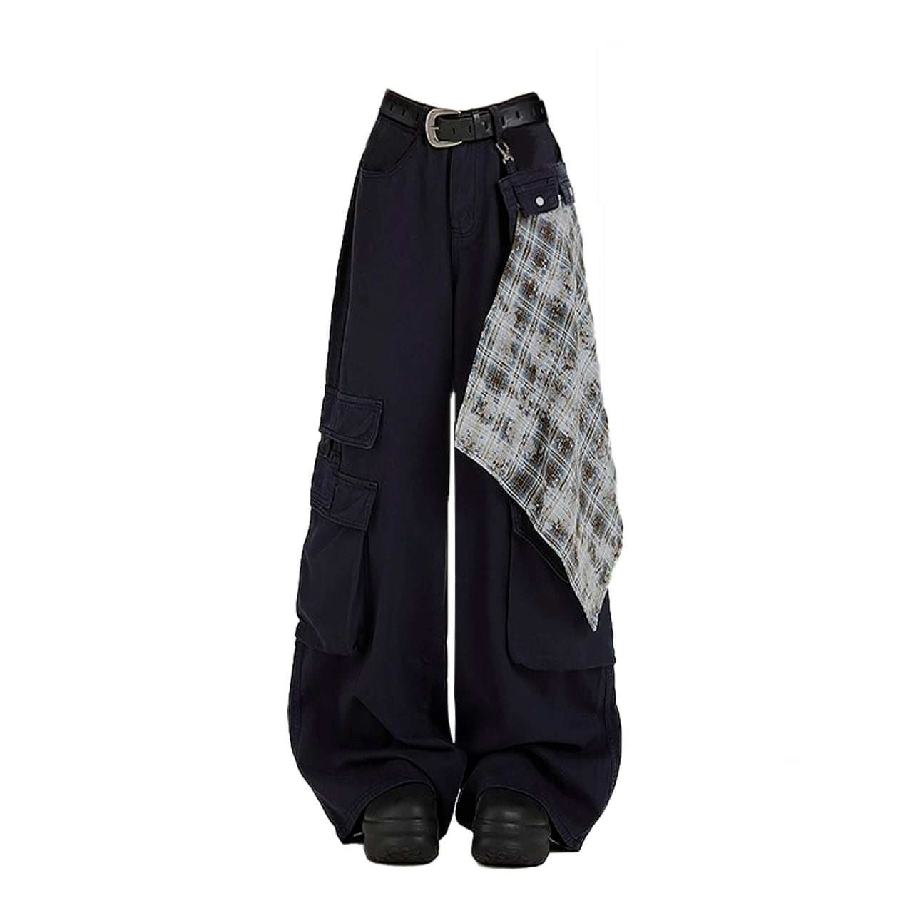 取り外し可能なチェック柄スカーフ付きのブラックカーゴジーンズ。