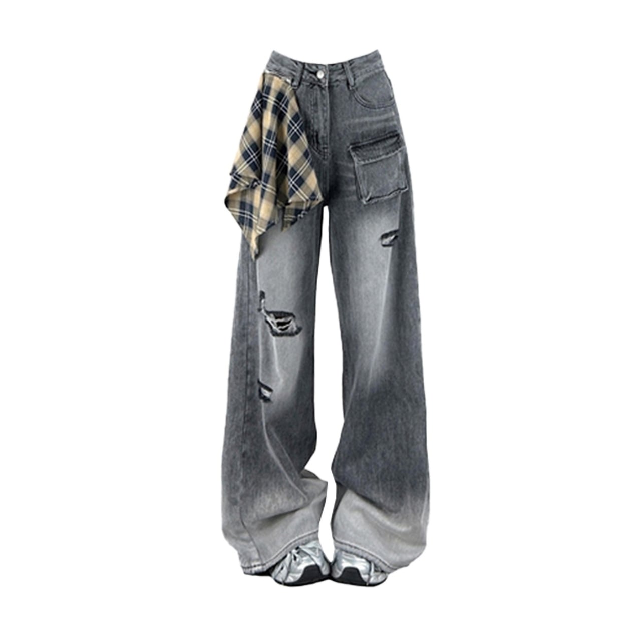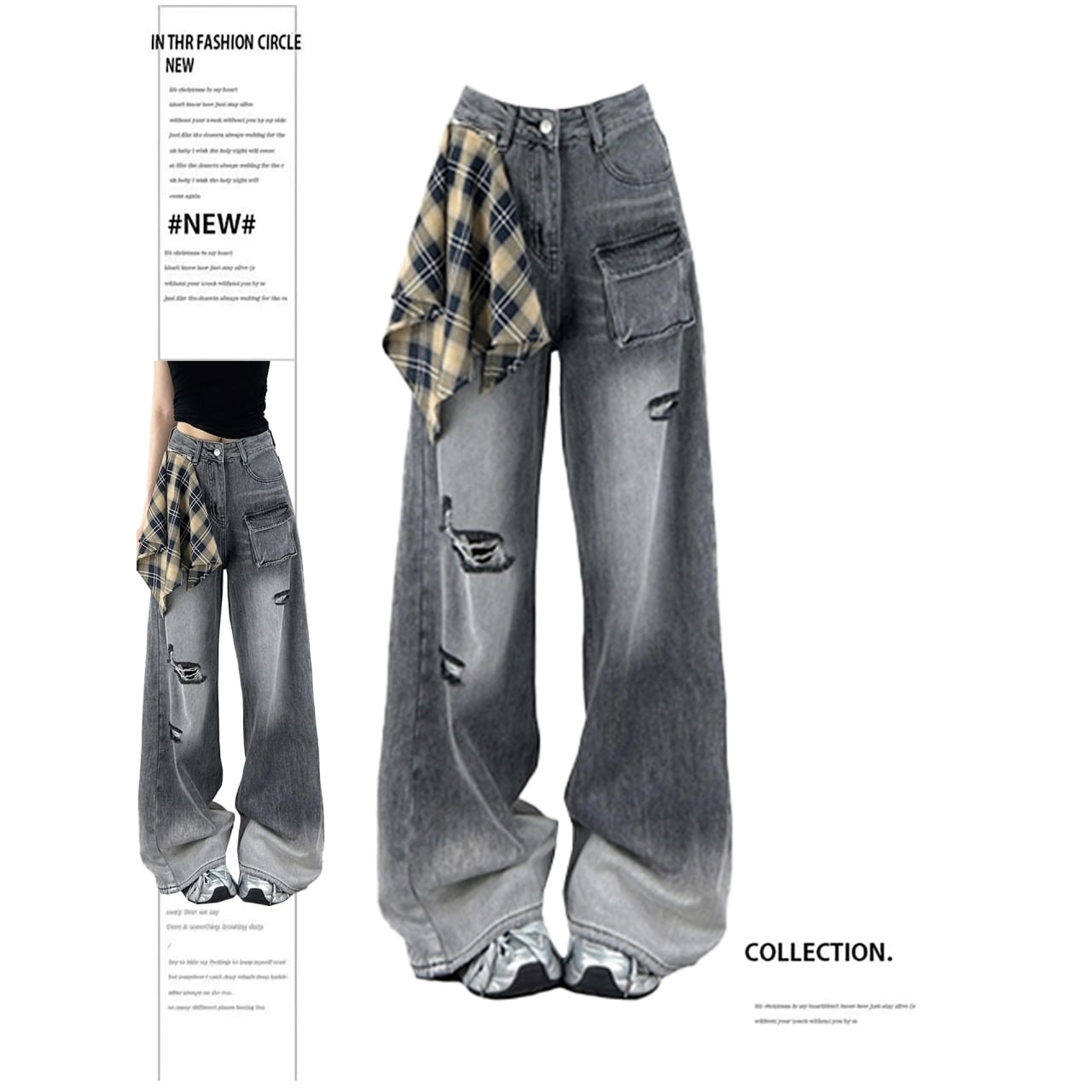 ダメージ加工が施された独特のデザインが魅力的なワイドストレートデニムジーンズ。